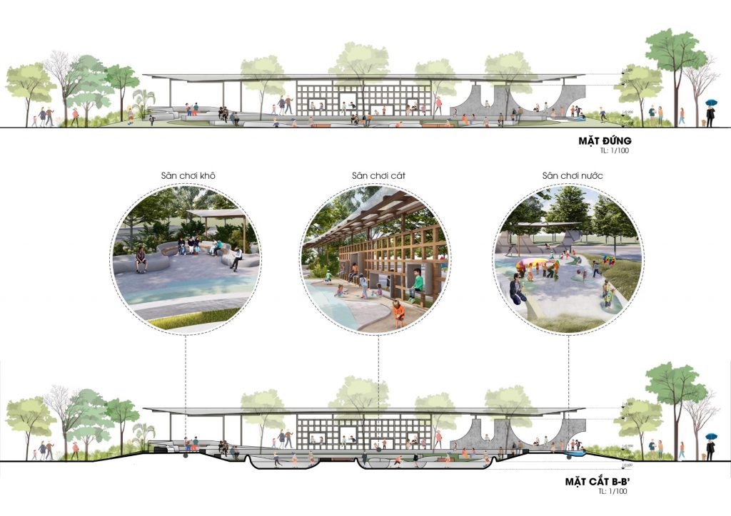 - Các khu sân chơi: không bố trí vật, đồ chơi cố định nhằm tạo khoảng không cho mọi người có thể vui đùa và sáng tạo, quan sát dễ hơn và tạo sự gắn kết.