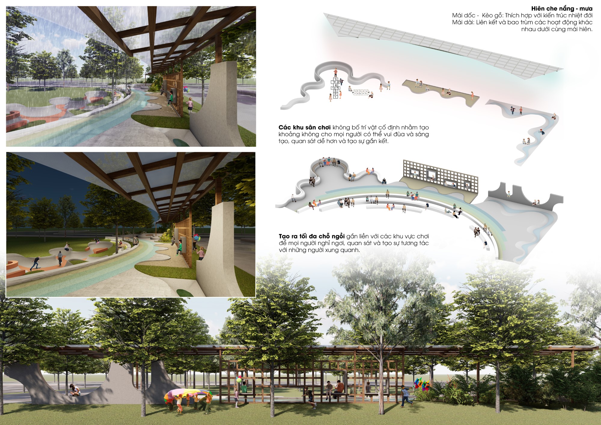 - Hiên che nắng – mưa- Mái dốc – Kèo gỗ: Thích hợp với kiến trúc nhiệt đới – Mái dài: Liên kết và bao trùm các hoạt động khác nhau dưới cùng mái hiên.