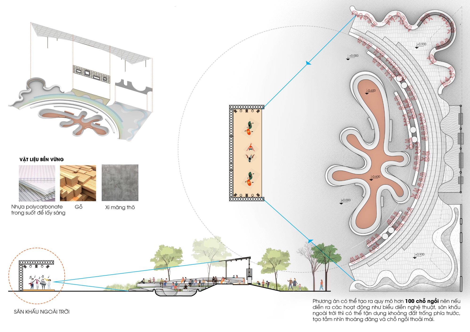 Phương án có thể tạo ra quy mô hơn 100 chỗ ngồi nên nếu tổ chức các hoạt động như biểu diễn nghệ thuật, sân khấu ngoài trời thì có thể tận dụng khoảng đất trống phía trước, tạo tầm nhìn thoáng đãng và chỗ ngồi thoải mái.
