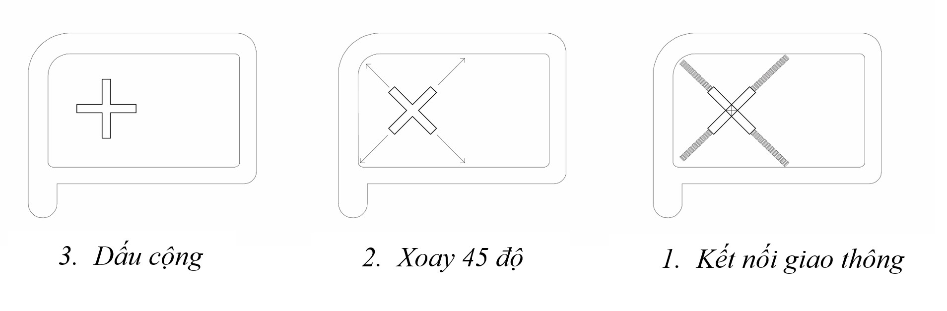Cảm hứng thiết kế đến từ một hình ảnh quen thuộc, đó là hình dấu “+” trong toán học, dấu cộng vừa mang hình ảnh cân đối, vững chãi vừa mang ý nghĩa gắn kết – phù hợp với tiêu chí kế nối từ không gian cần thiết kế.