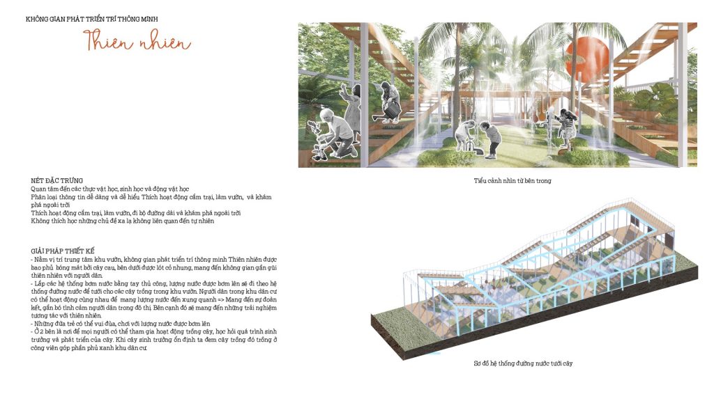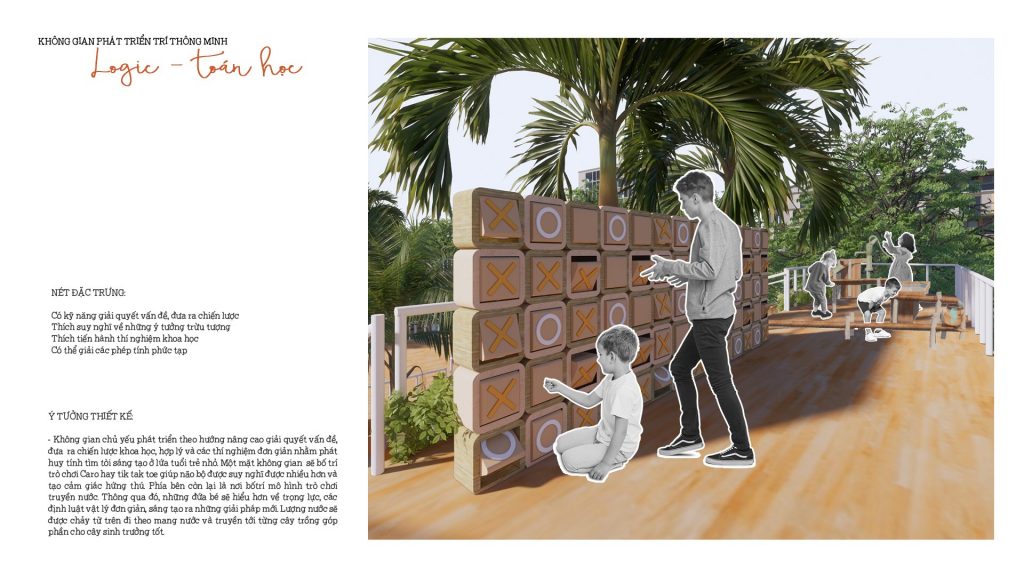 - Không gian chủ yếu phát triển theo hướng nâng cao giải quyết vấn đề, đưa ra chiến lược khoa học, hợp lý và các thí nghiệm đơn giản nhằm phát huy tính tìm tòi sáng tạo ở lứa tuổi trẻ nhỏ. Một mặt không gian sẽ bố trí trò chơi Caro hay tik tak toe giúp não bộ được suy nghĩ được nhiều hơn và tạo cảm giác hứng thú. Phía bên còn lại là nơi bốtrí mô hình trò chơi truyền nước. Thông qua đó, những đứa bé sẽ hiểu hơn về trọng lực, các định luật vật lý đơn giản, sáng tạo ra những giải pháp mới. Lượng nước sẽ được chảy từ trên đi theo mang nước và truyền tới từng cây trồng góp phần cho cây sinh trưởng tốt.