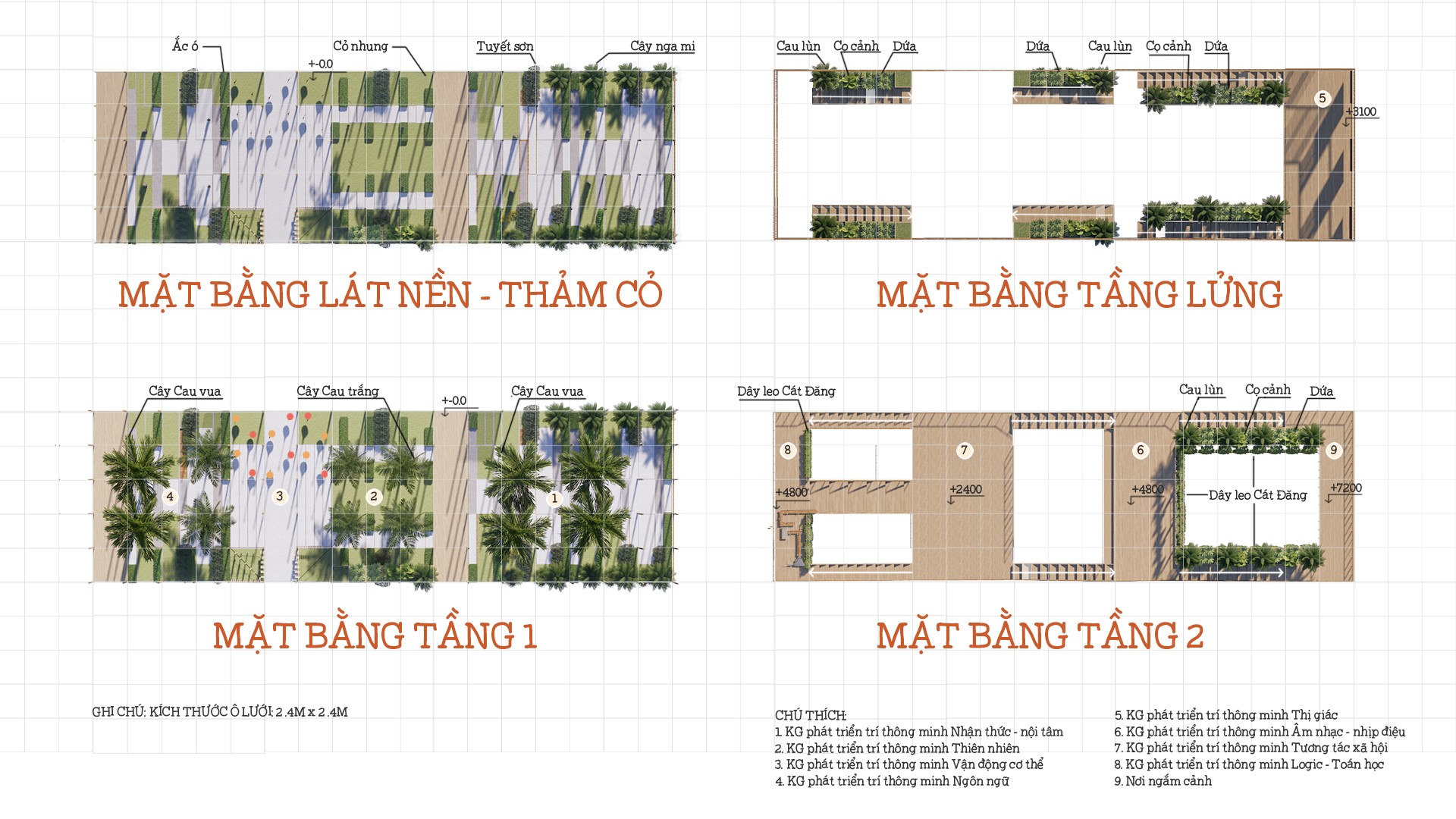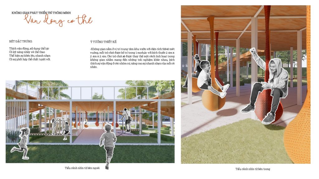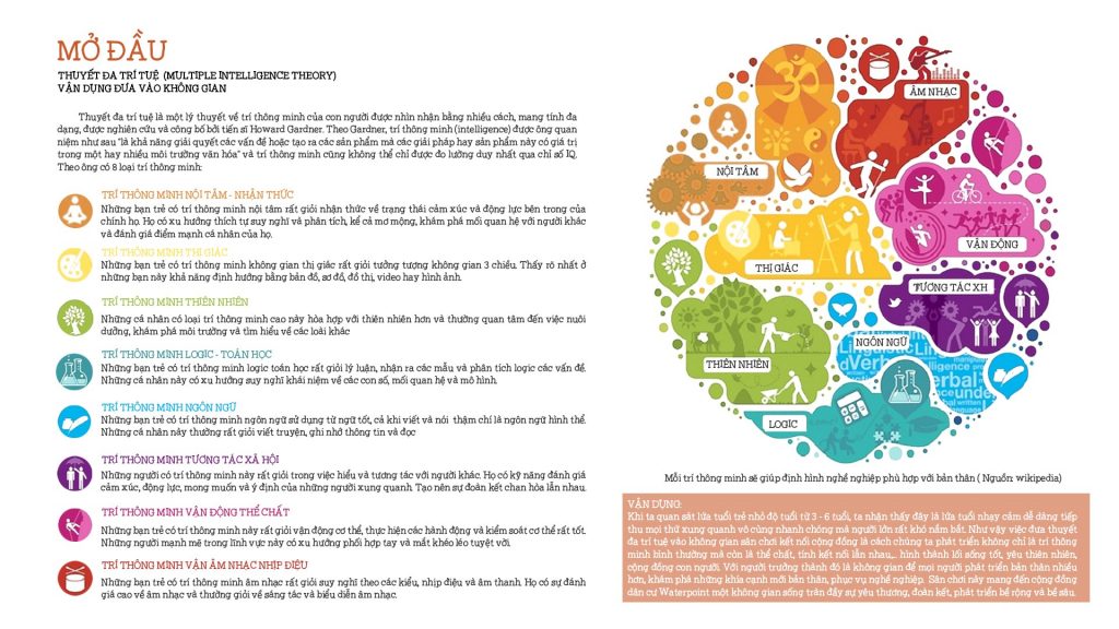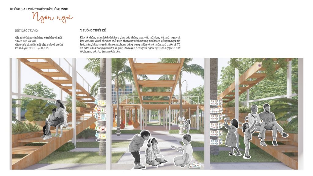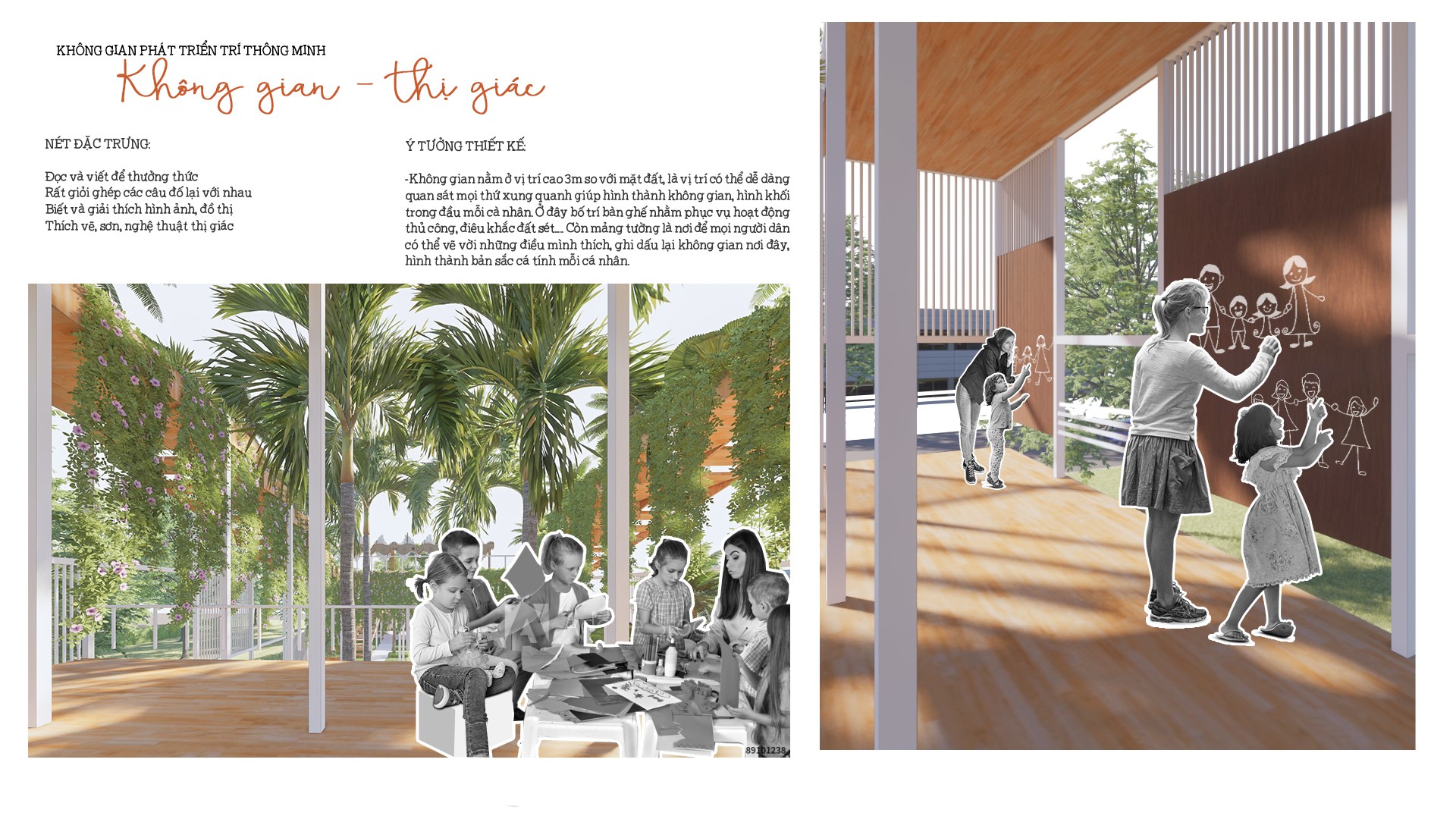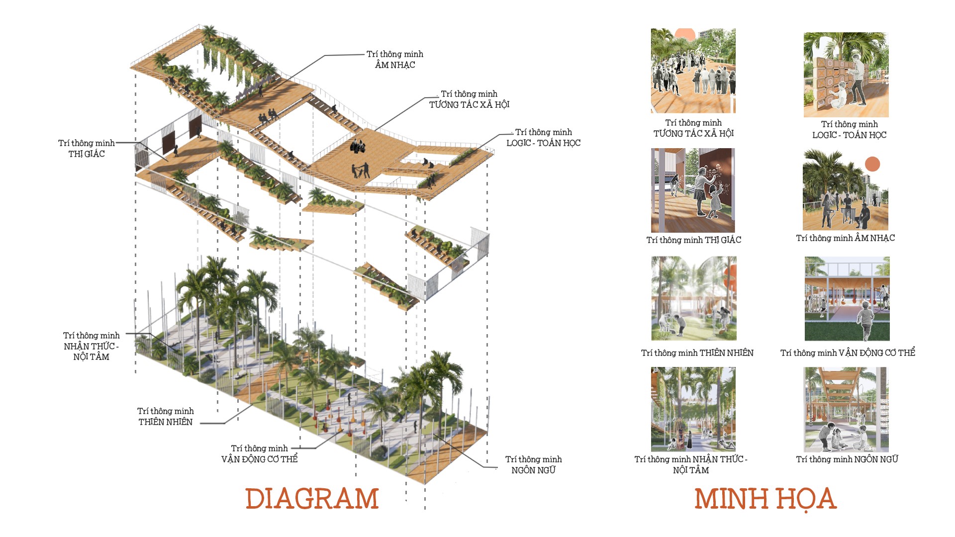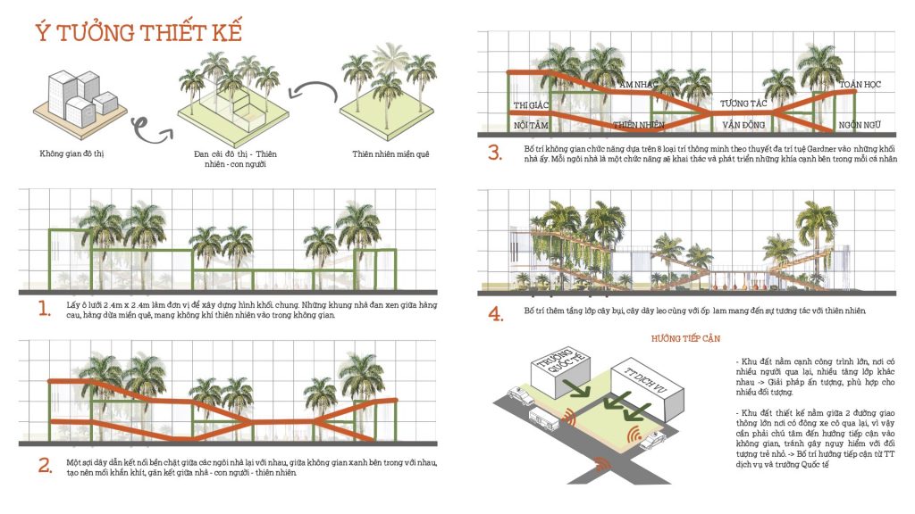 - Bố trí không gian chức năng dựa trên 8 loại trí thông minh theo thuyết đa trí tuệ Gardner vào những khối nhà ấy. Mỗi ngôi nhà là một chức năng sẽ khai thác và phát triển những khía cạnh bên trong mỗi cá nhân.