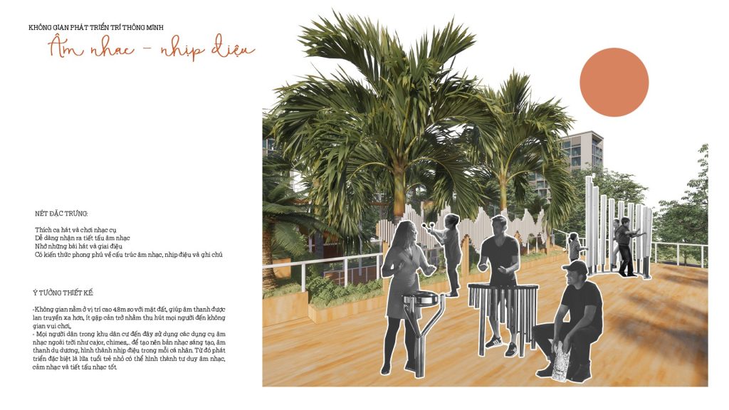 - Mọi người dân trong khu dân cư đến đây sử dụng các dụng cụ âm nhạc ngoài trời như cajor, chimes,… để tạo nên bản nhạc sáng tạo, âm thanh du dương, hình thành nhịp điệu trong mỗi cá nhân. Từ đó phát triển đặc biệt là lứa tuổi trẻ nhỏ có thể hình thành tư duy âm nhạc, cảm nhạc và tiết tấu nhạc tốt.