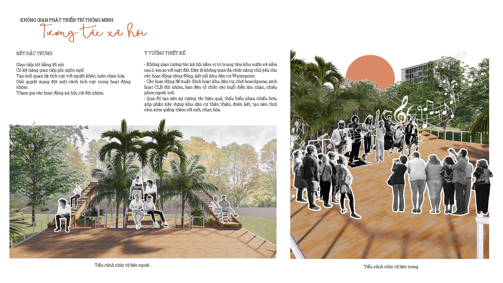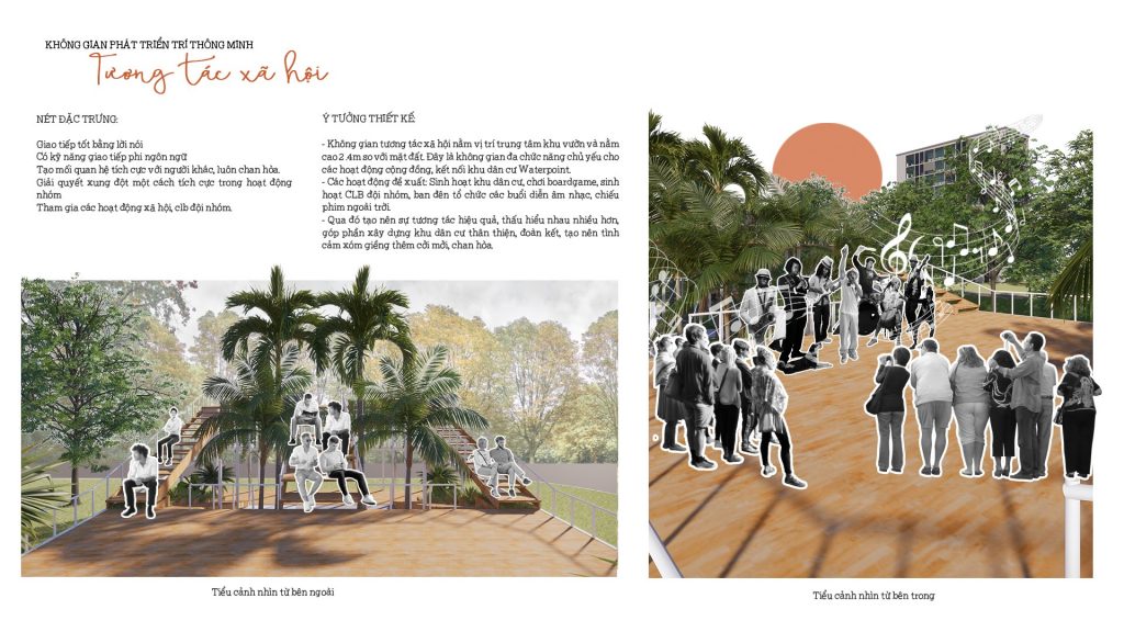 - Không gian tương tác xã hội nằm vị trí trung tâm khu vườn và nằm cao 2 .4m so với mặt đất. Đây là không gian đa chức năng chủ yếu cho các hoạt động cộng đồng, kết nối khu dân cư Waterpoint.