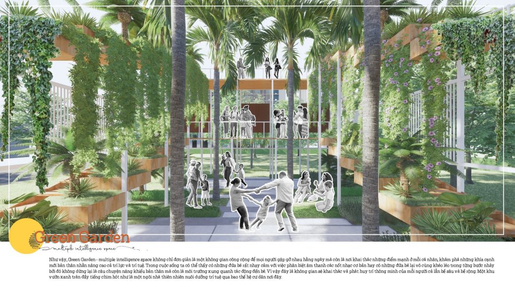 Như vậy, Green Garden – multiple intelligence space không chỉ đơn giản là một không gian công cộng để mọi người gặp gỡ nhau hằng ngày mà còn là nơi khai thác những điểm mạnh ở mỗi cá nhân, khám phá những khía cạnh mới bản thân nhằn nâng cao cả trí lực và trí tuệ. Trong cuộc sống ta có thể thấy có những đứa bé rất nhạy cảm với việc phân biệt âm thanh các nốt nhạc cơ bản hay có những đứa bé lại vô cùng khéo léo trong từng bước nhảy bởi đó không dừng lại là câu chuyện năng khiếu bản thân mà còn là môi trường xung quanh tác động đến bé. Vì vậy đây là không gian sẽ khai thác và phát huy trí thông minh của mỗi người cả lẫn bề sâu và bề rộng. Một khu vườn xanh tràn đầy tiếng chim hót như là một ngôi nhà thiên nhiên nuôi dưỡng trí tuệ qua bao thế hệ cư dân nơi đây.