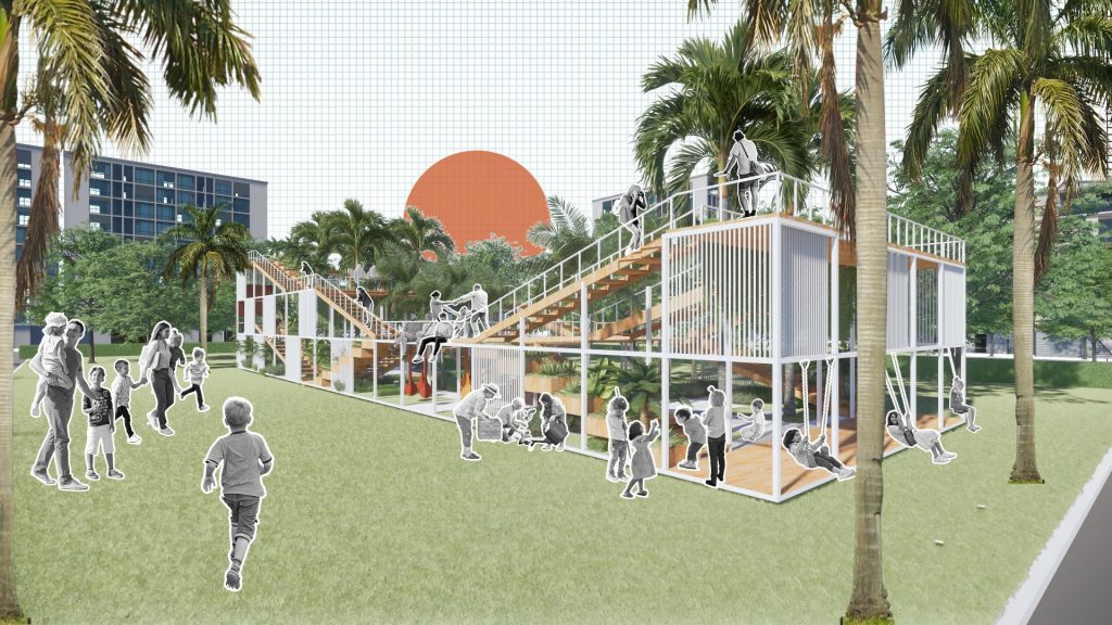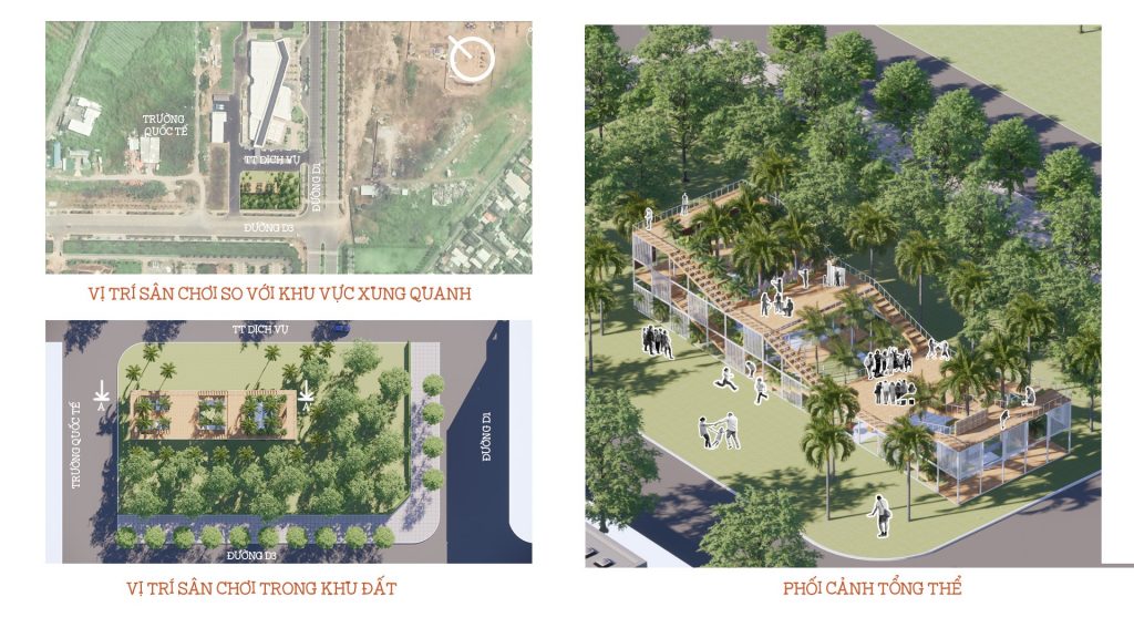 - Không gian nằm ở vị trí cao 4.8m so với mặt đất, giúp âm thanh được lan truyền xa hơn, ít gặp cản trở nhằm thu hút mọi người đến không gian vui chơi.
