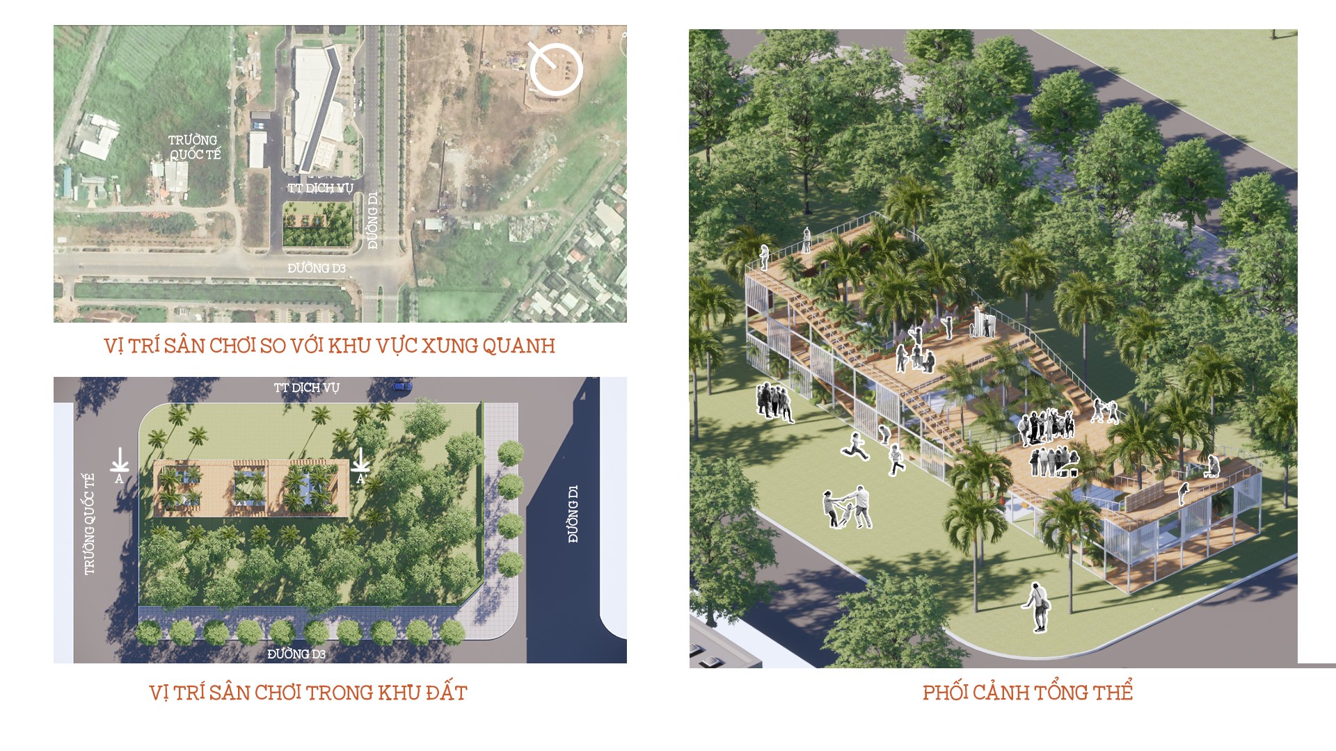 - Khu đất nằm cạnh công trình lớn, nơi có nhiều người qua lại, nhiều tâng lớp khác nhau -> Giải pháp ấn tượng, phù hợp cho nhiều đối tượng. Khu đất thiết kế nằm giữa 2 đường giao thông lớn nơi có đông xe cô qua lại, vì vậy cần phải chú tâm đến hướng tiếp cận vào không gian, tránh gây nguy hiểm với đối tượng trẻ nhỏ. -> Bố trí hướng tiếp cận từ TT dịch vụ và trường Quốc tế