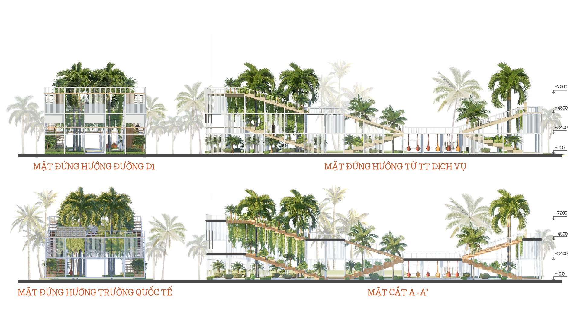 - Lấy ô lưới 2 .4m x 2 .4m làm đơn vị để xây dựng hình khối. chung. Những khung nhà đan xen giữa hàng cau, hàng dừa miền quê, mang không khí thiên nhiên vào trong không gian.