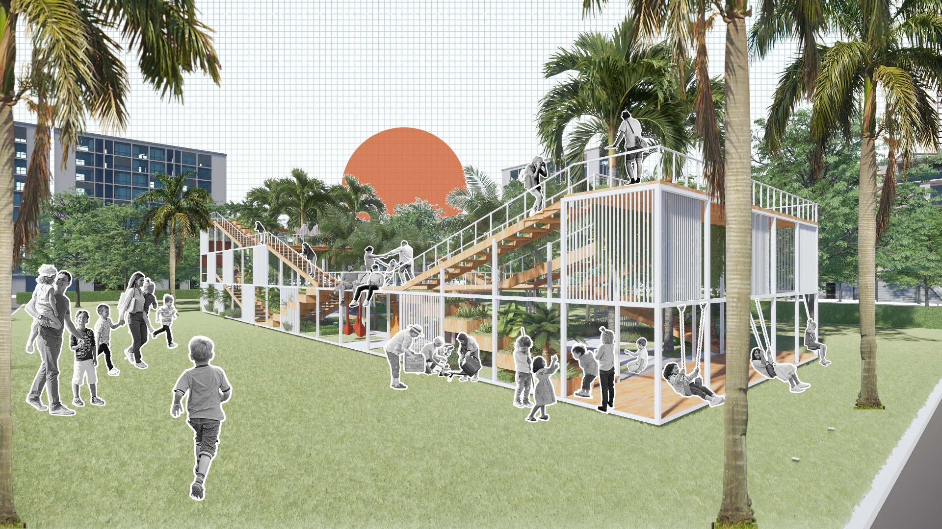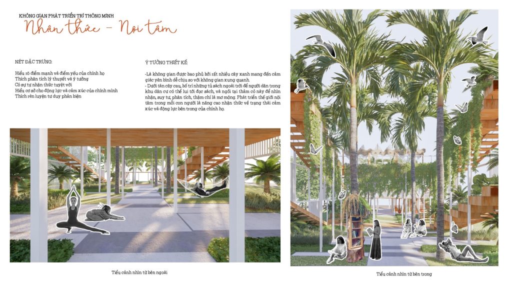 - Dưới tán cây cau, bố trí những tủ sách ngoài trời để người dân trong khu dân cư có thể lui tới đọc sách, và ngồi tại thảm cỏ này để nhìn nhận, suy tư, phân tích, thậm chí là mơ mộng. Phát triển thế giới nội tâm trong mỗi con người là nâng cao nhận thức về trạng thái cảm xúc và động lực bên trong của chính họ.