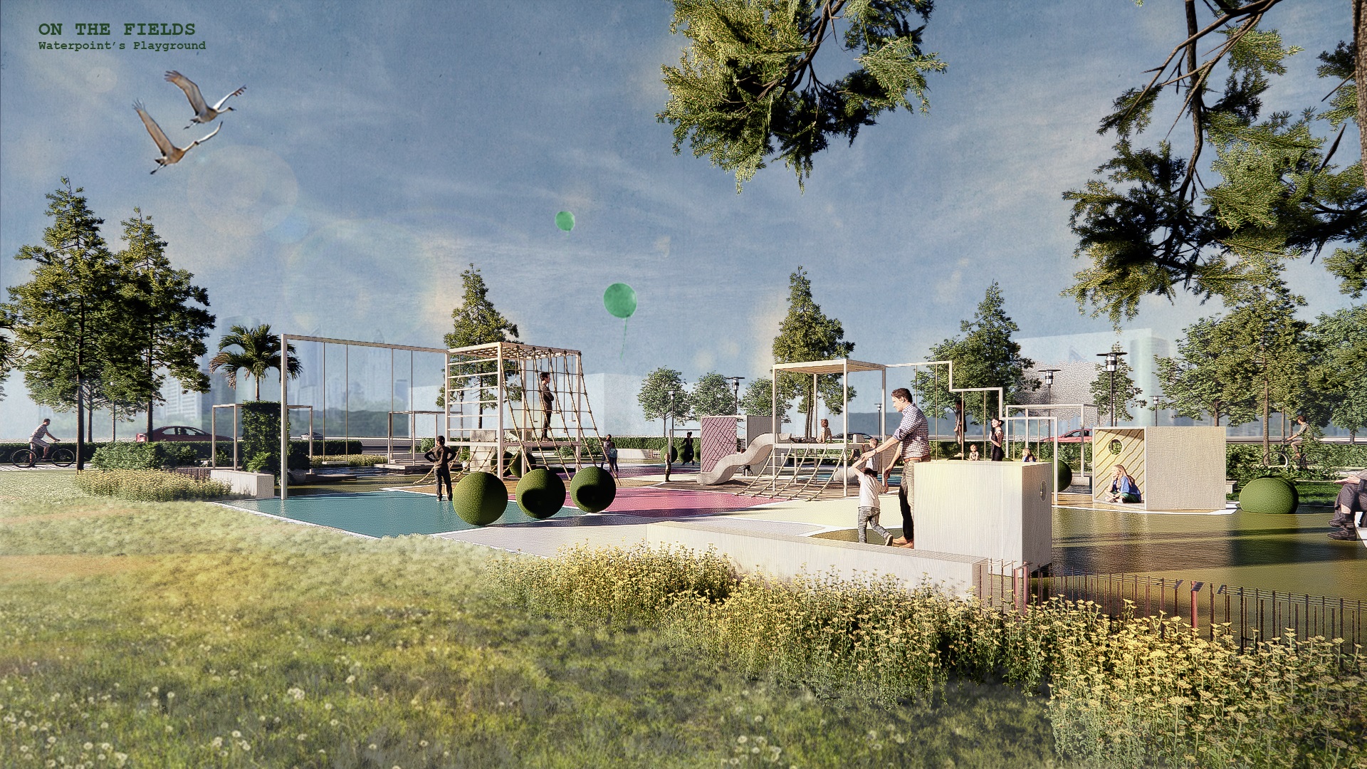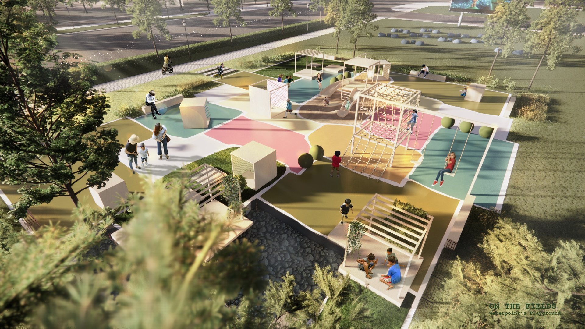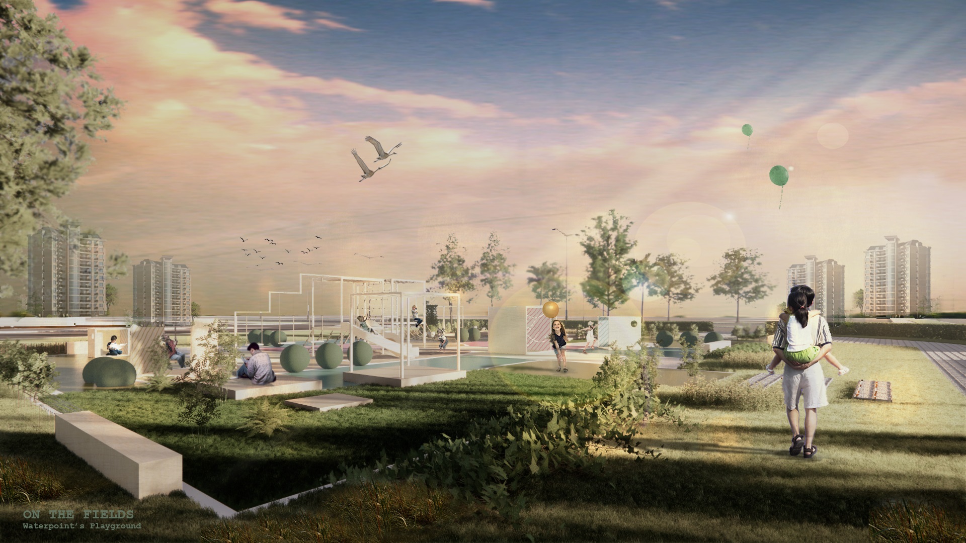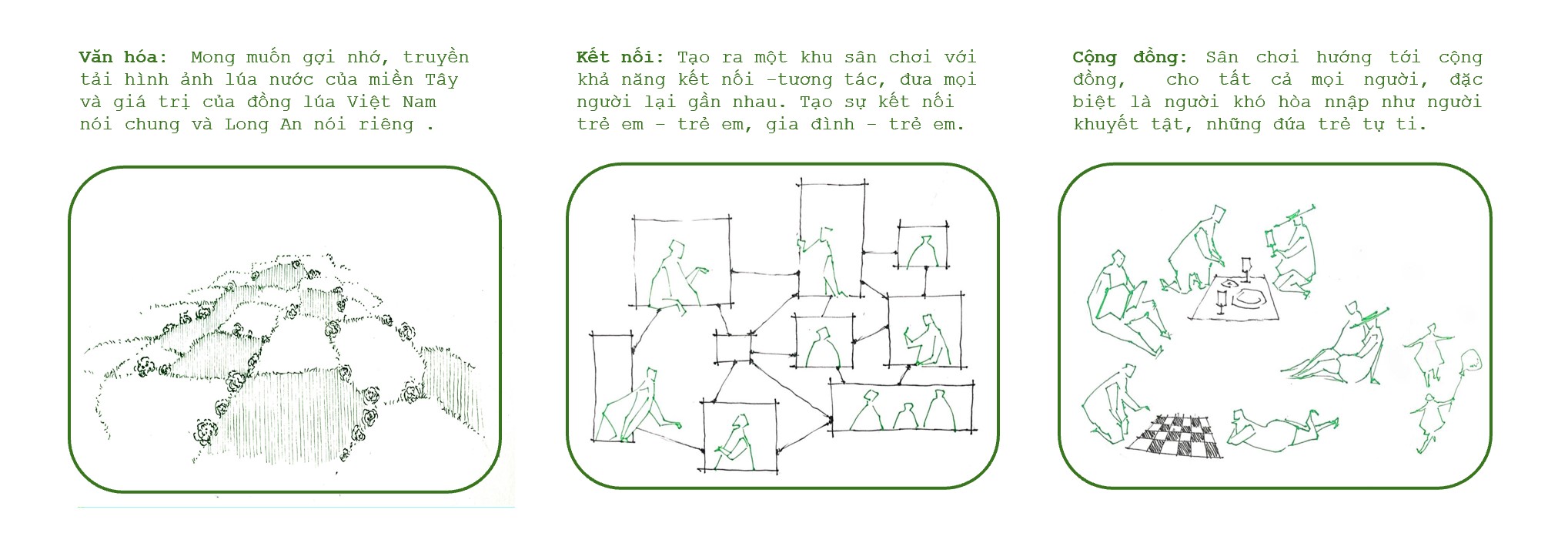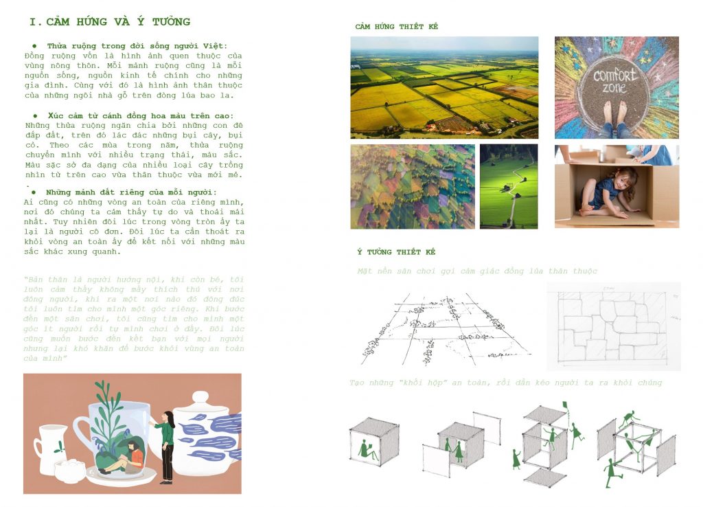 Lấy cảm hứng từ những thửa ruộng, những cánh đồng hoa màu trong cuộc sống người Việt và cả hình tượng những mảnh đất riêng của mỗi người. Thiết kế playground chú trọng vào các yếu tố: Kết nối – Dẫn dắt – Đa dạng – An toàn.