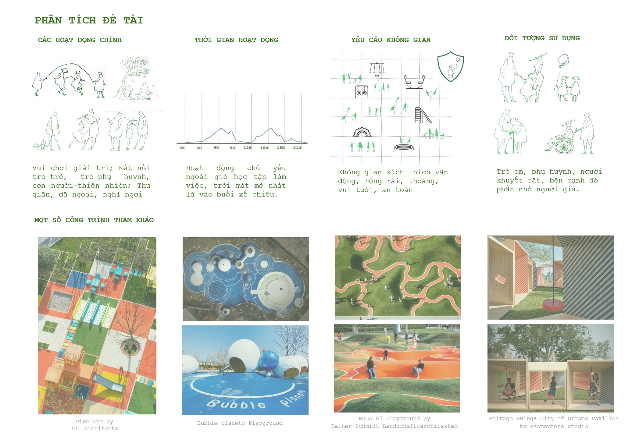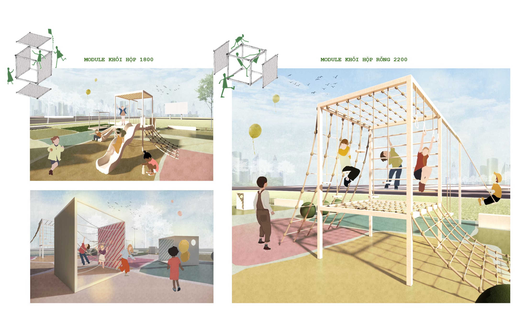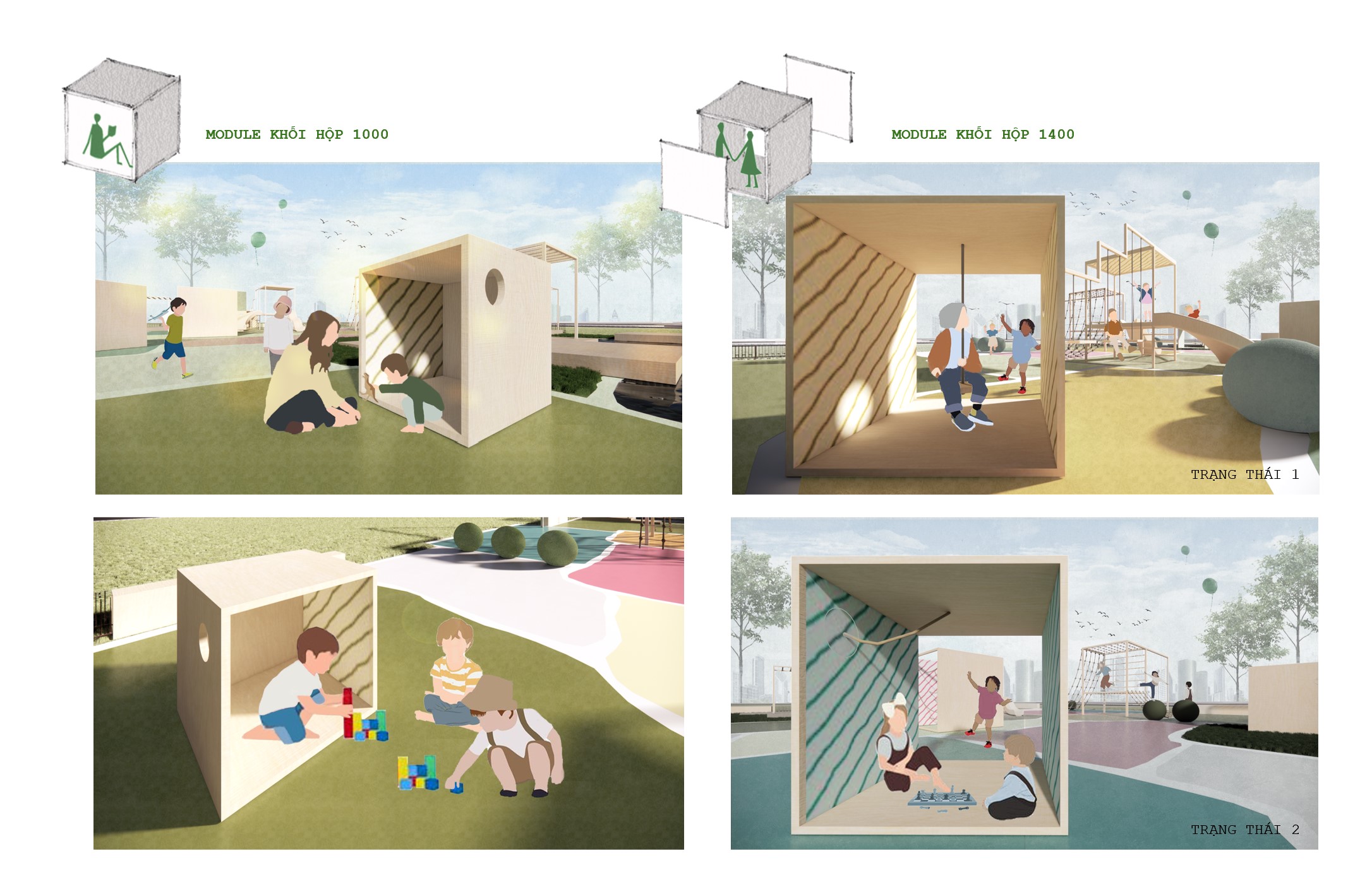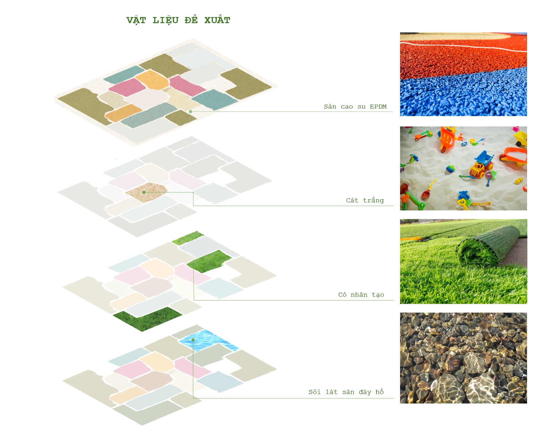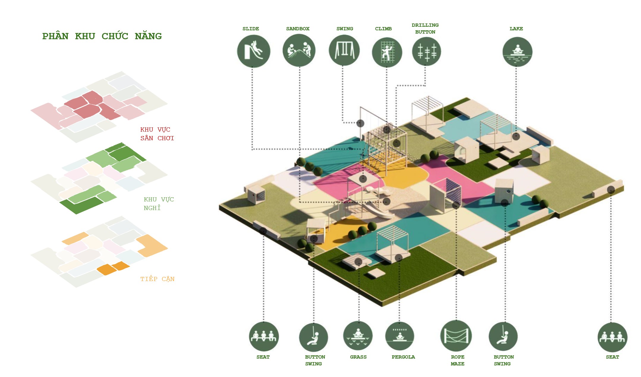 Đa dạng: Bố trí hoạt động đa dạng: chơi, nghỉ, trò chuyện, hồ nước bãi cỏ Phân chia các hộp trò chơi với độ khó khác nhau.