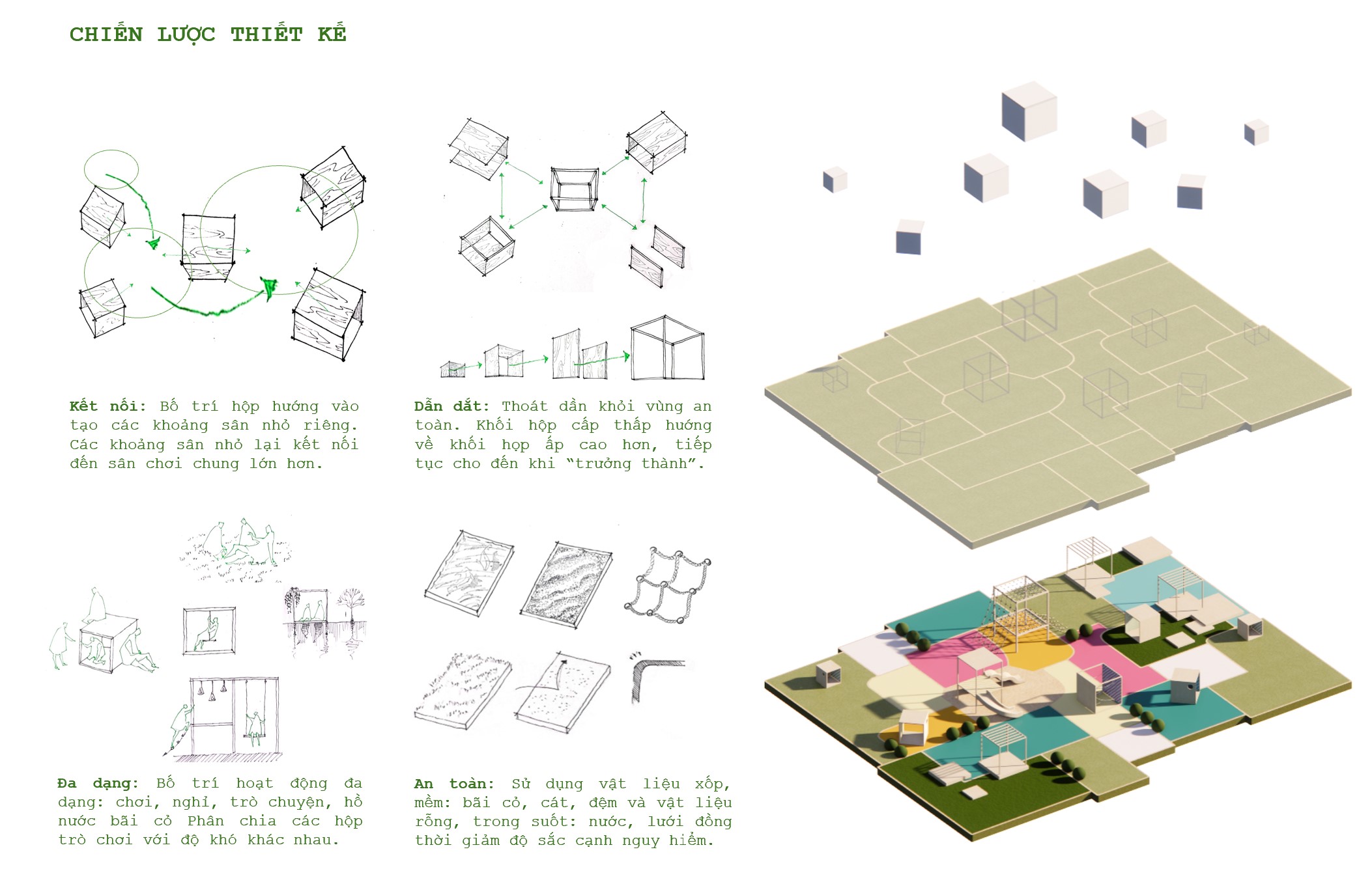 Kết nối: Bố trí hộp hướng vào tạo các khoảng sân nhỏ riêng. Các khoảng sân nhỏ lại kết nối đến sân chơi chung lớn hơn.