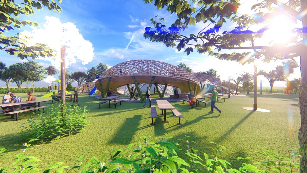 Sử dụng vật liệu hiện đại thép, kính cho kết cấu chòi nghỉ hình cầu tạo điểm nhấn giữa những đường cong.