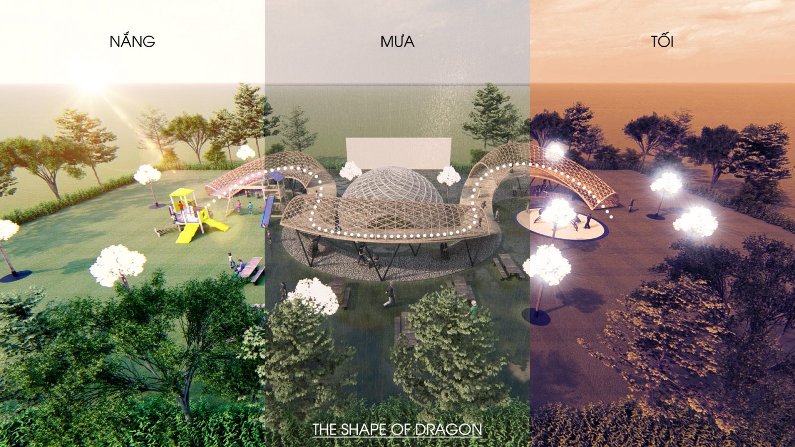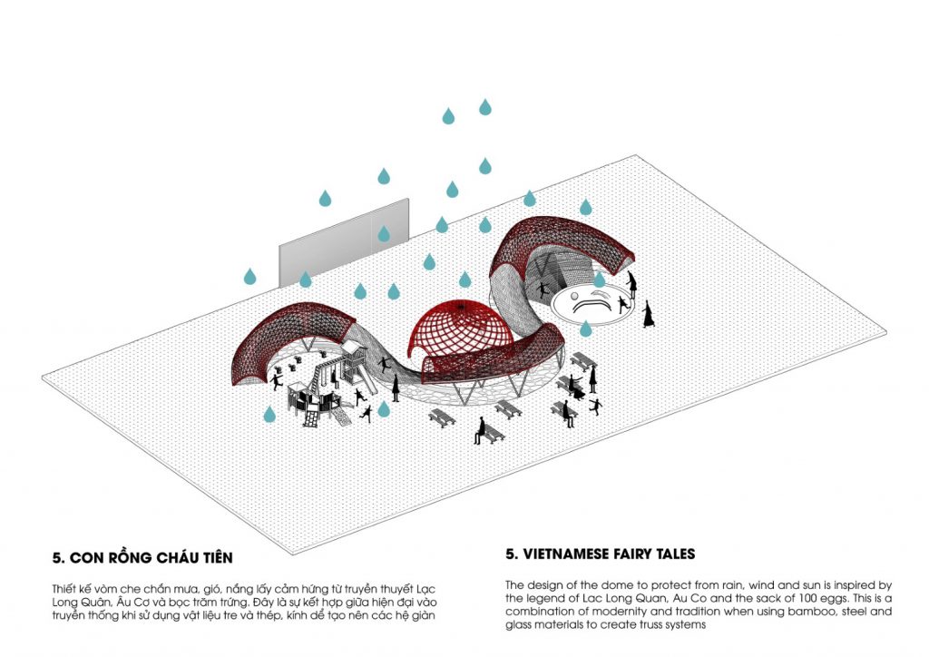 Thiết kế vòm che chắn mưa, gió, nắng lấy cảm hứng từ truyền thuyết Lạc Long Quân, Âu Cơ và bọc trăm trứng. Đây là sự kết hợp giữa hiện đại vào truyền thống khi sử dụng vật liệu tre và thép, kính dể tạo nên các hệ giàn.