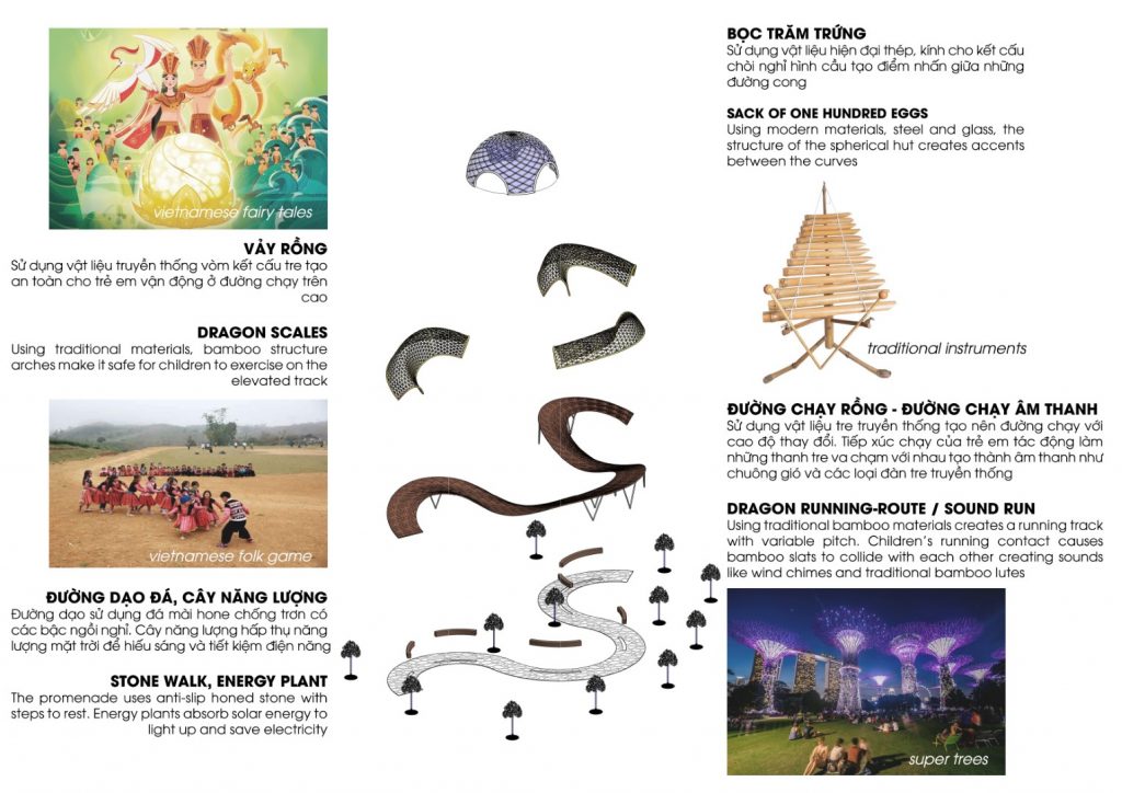 Sử dụng vật liệu tre truyền thống tạo nên đường chạy với cao độ thay đổi. Tiếp xúc chạy của trẻ em tác động làm những thanh tre va chạm với nhau tạo thành âm thanh như chuông gió và các loại đàn tre truyền thống.