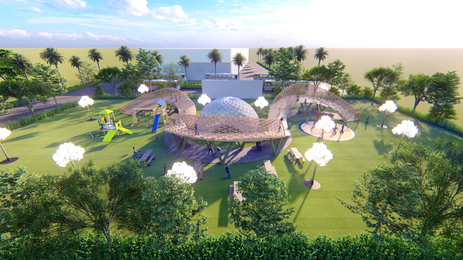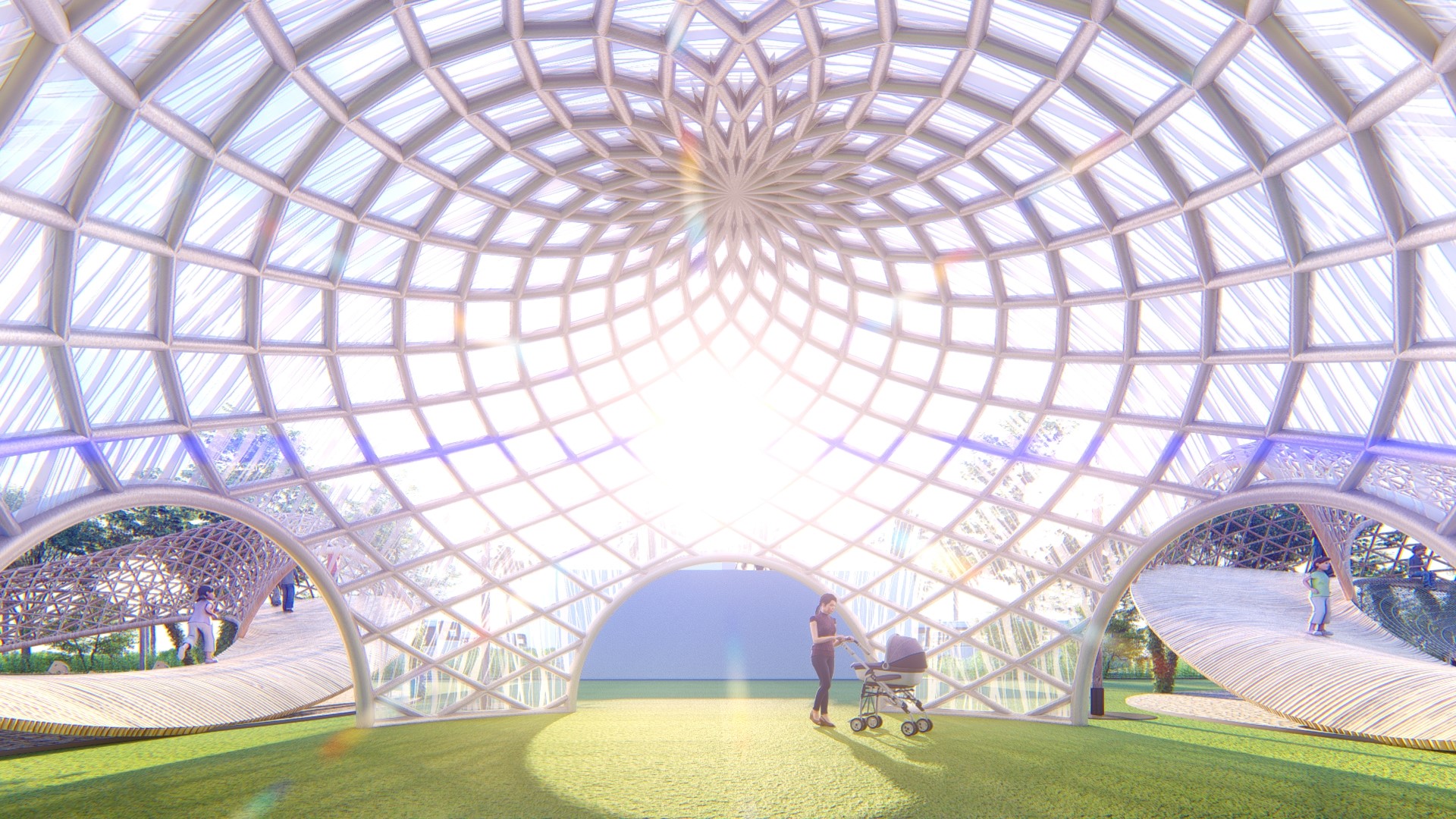 Sử dụng vật liệu hiện đại thép, kính cho kết cấu chòi nghỉ hình cầu tạo điểm nhấn giữa những đường cong.