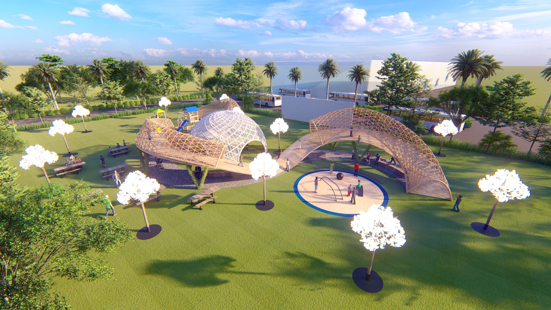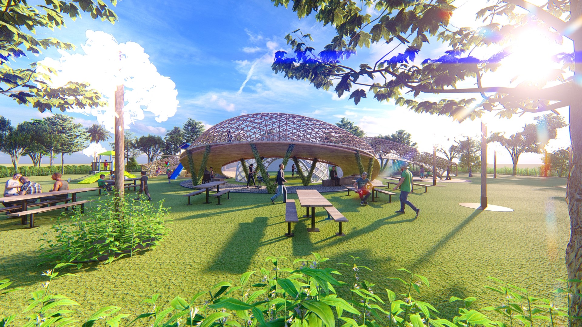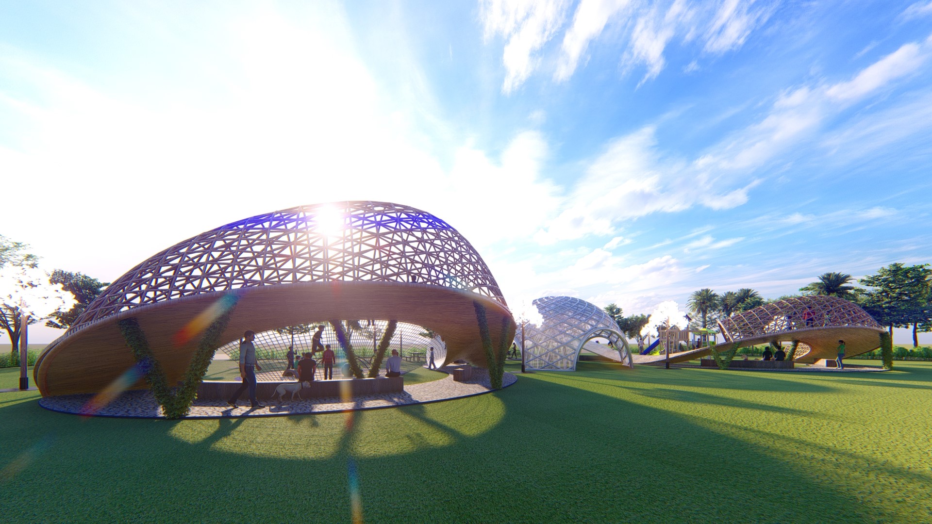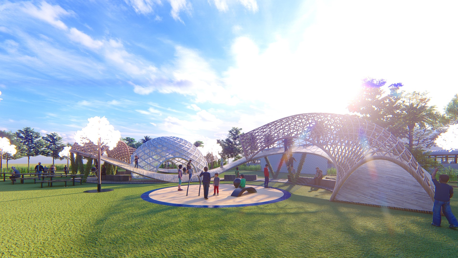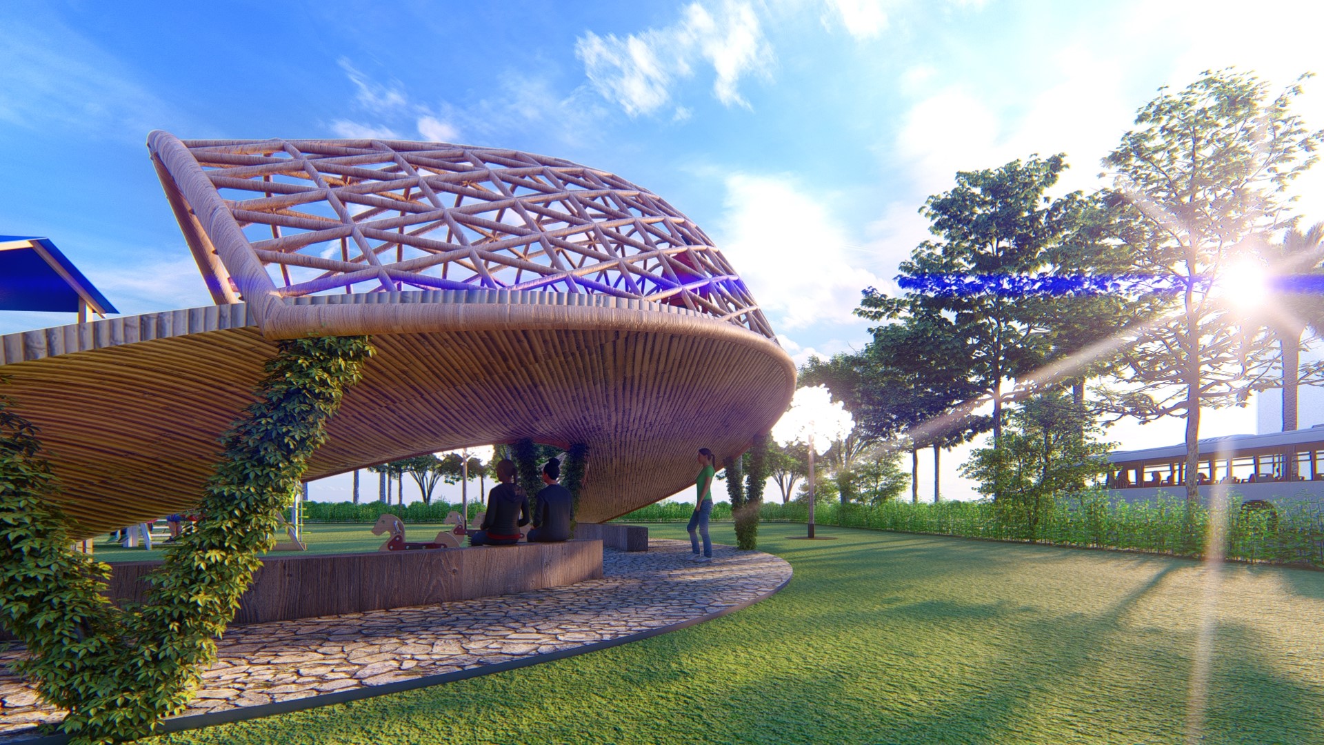 Sử dụng vật liệu truyền thống vòm kết cấu tre tạo an toàn cho trẻ em vận động ở đường chạy trên cao.