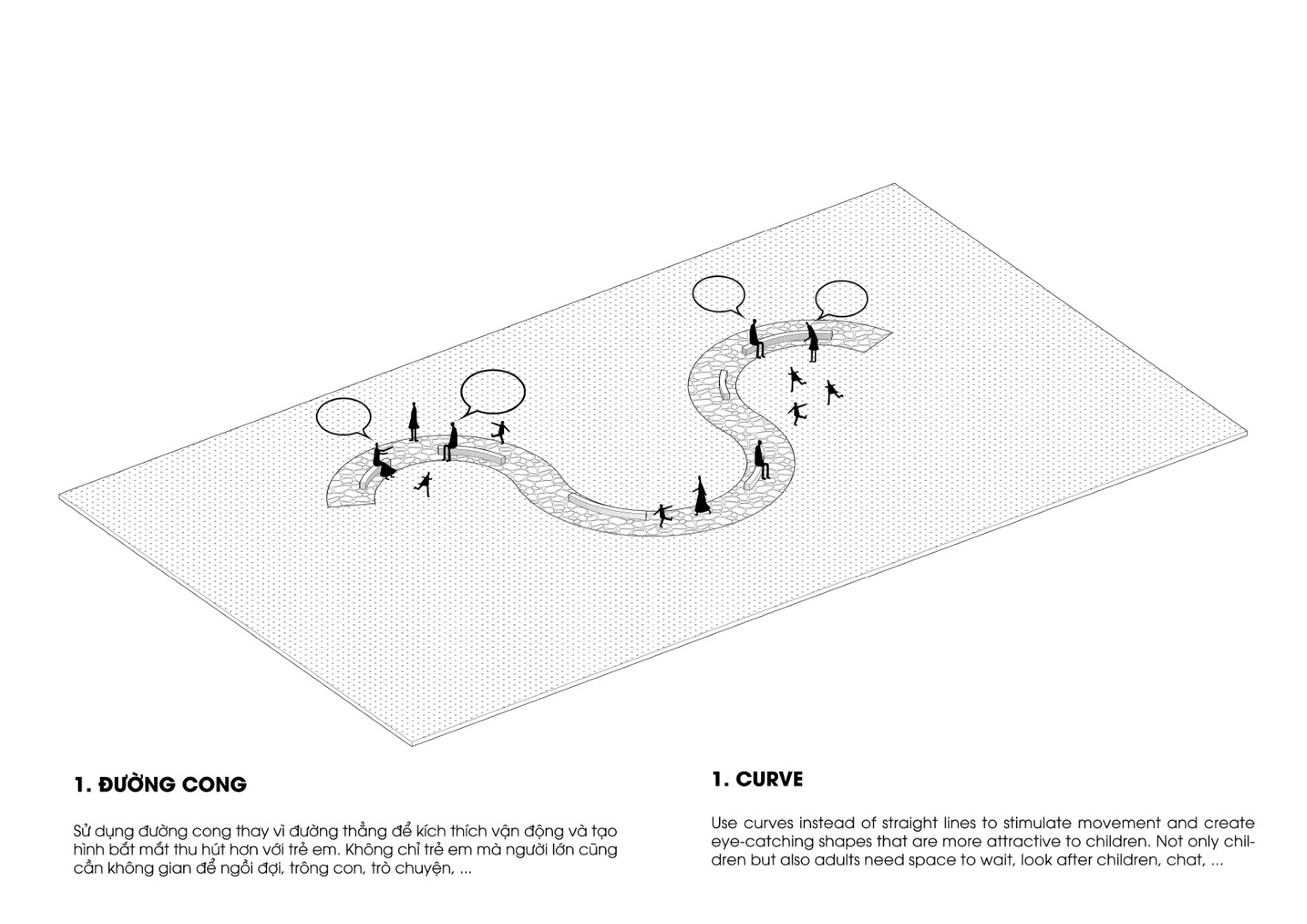 Sử dụng đường cong thay vì đường thẳng để kích thích vận động và tạo hình bắt mắt thu hút hơn với trẻ em. Không chỉ trẻ em mà người lớn cũng cần không gian để ngồi đợi, trông con, trò chuyện, …