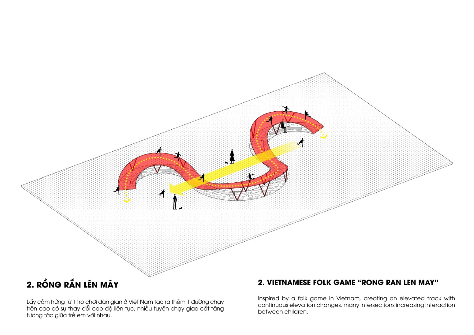 Lấy cảm hứng từ 1 trò chơi dân gian ở Việt Nam tạo ra thêm 1 đường chạy trên cao có sự thay đổi cao độ liên tục, nhiều tuyến chạy giao cắt tăng tương tác giữa trẻ em với nhau.
