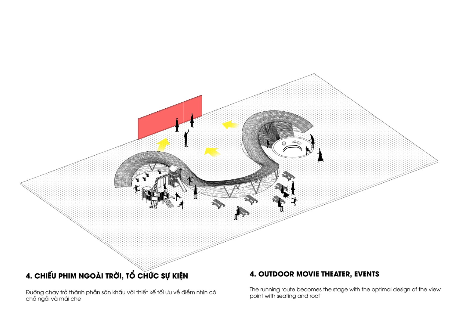 Đường chạy trở thành phần sân khấu với thiết kế tối ưu về điểm nhìn có chỗ ngồi và mái che.