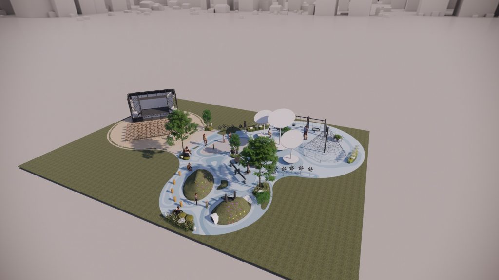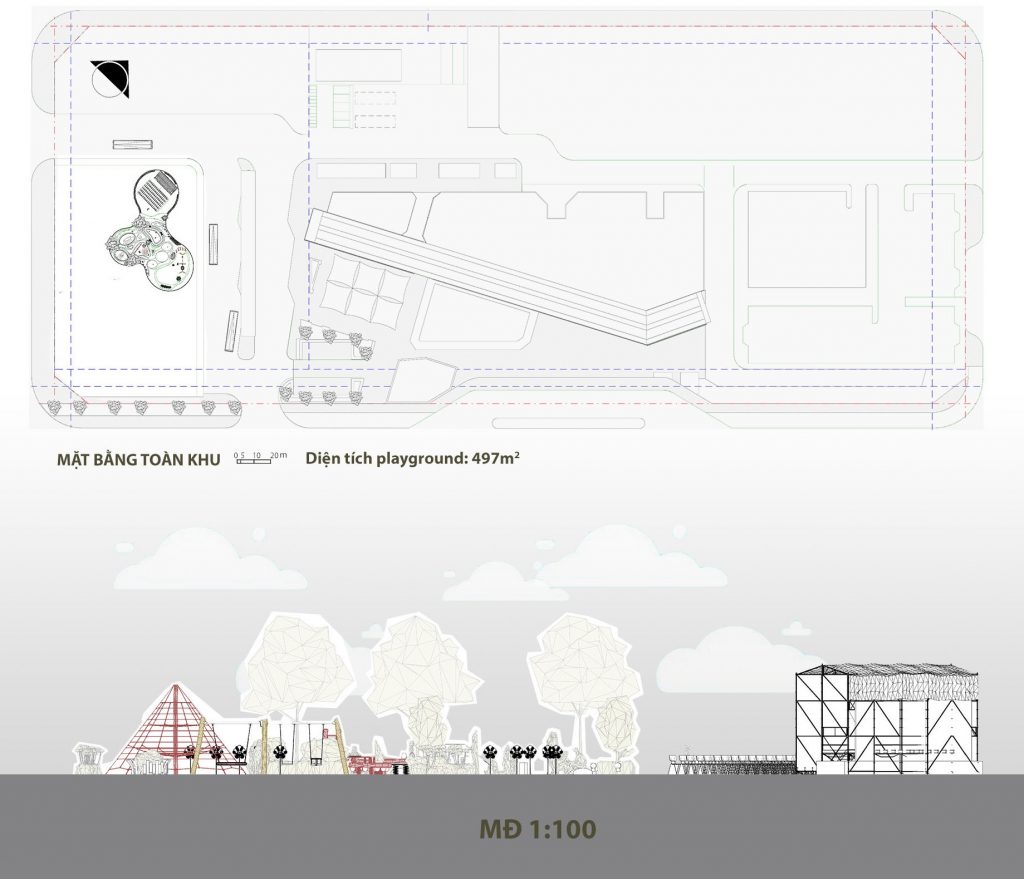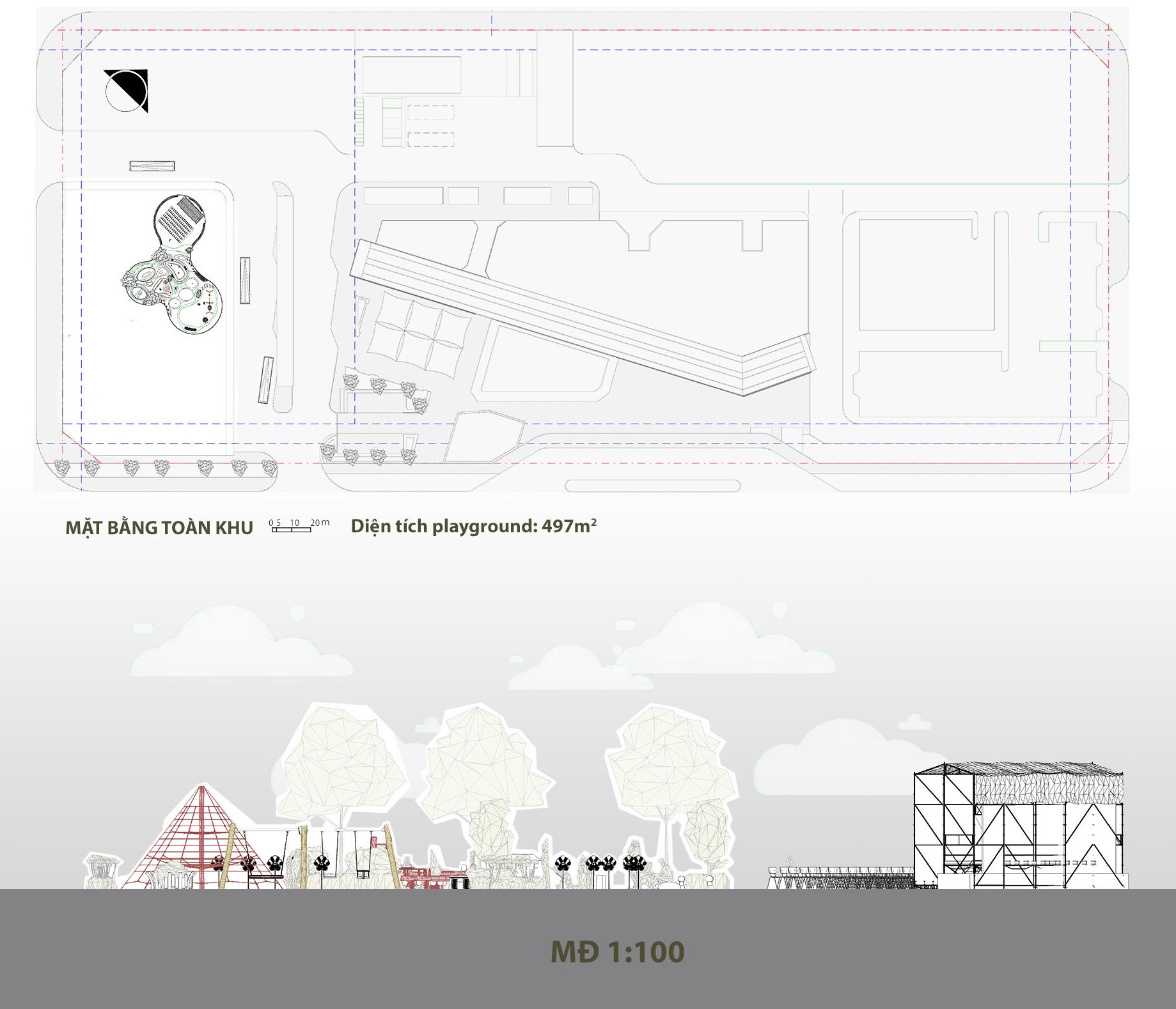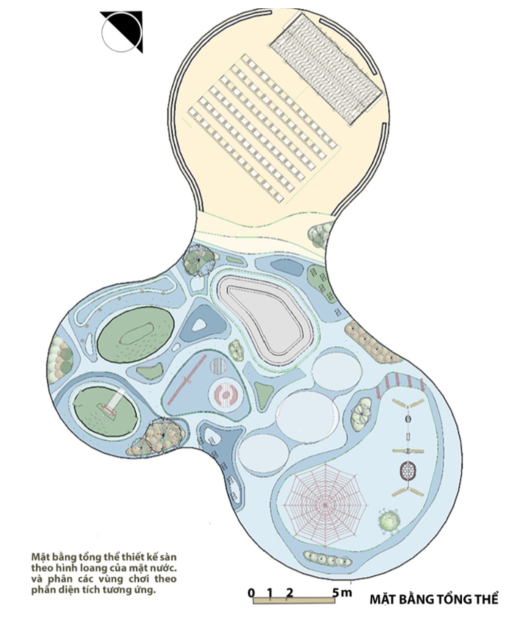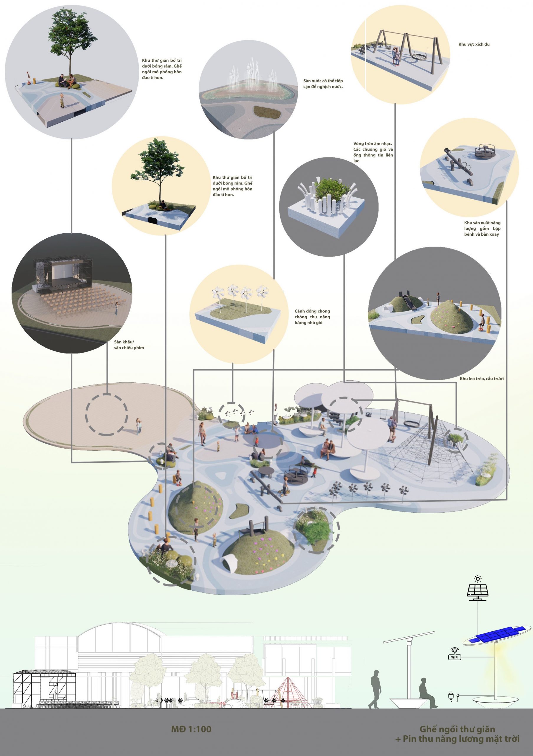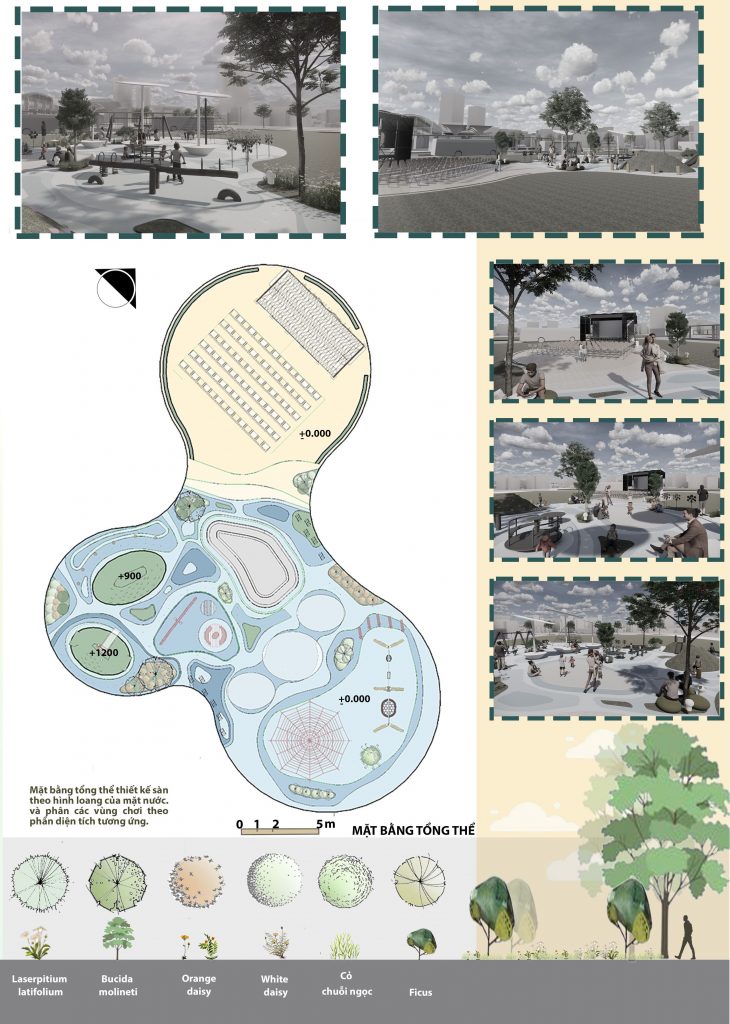 Lấy cảm hứng từ chính thành phố bên sông – chủ đề sông nước. Ý tưởng của em là tạo nên một khu vui chơi mô phỏng mặt nước và các vùng đất liền.