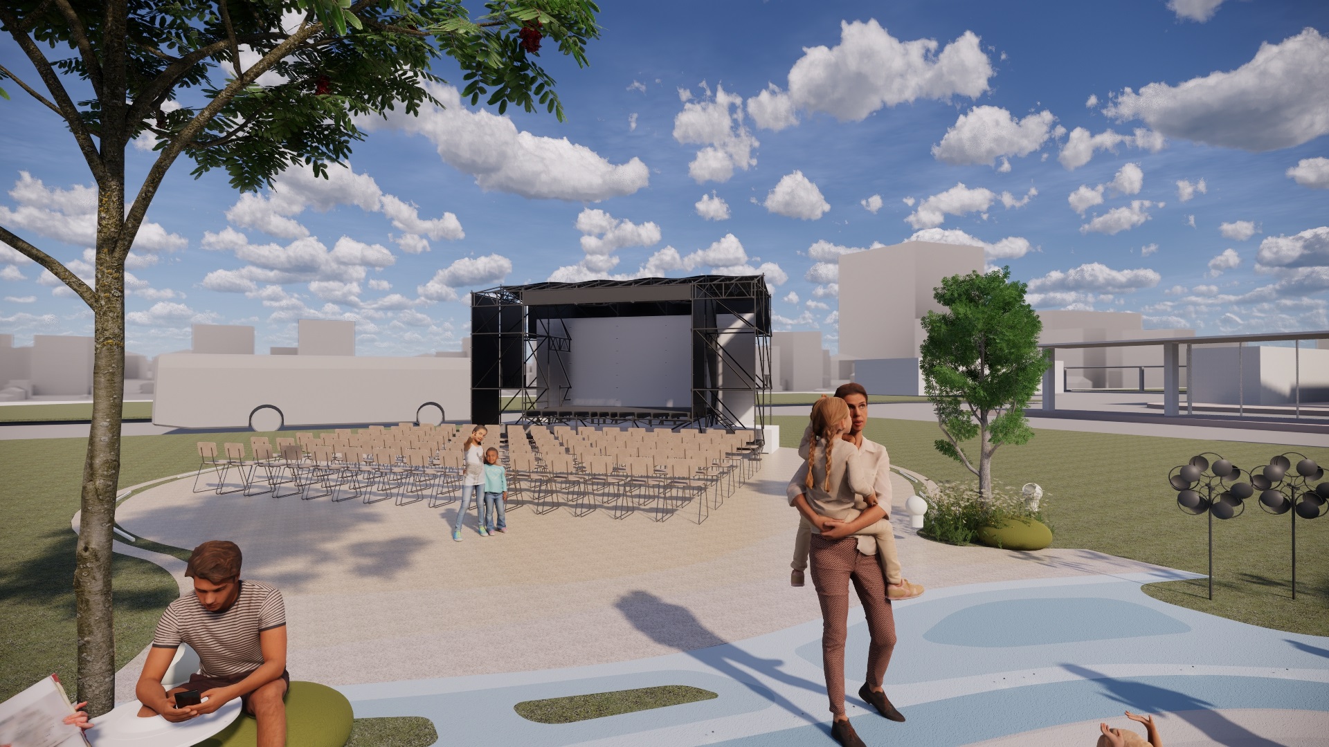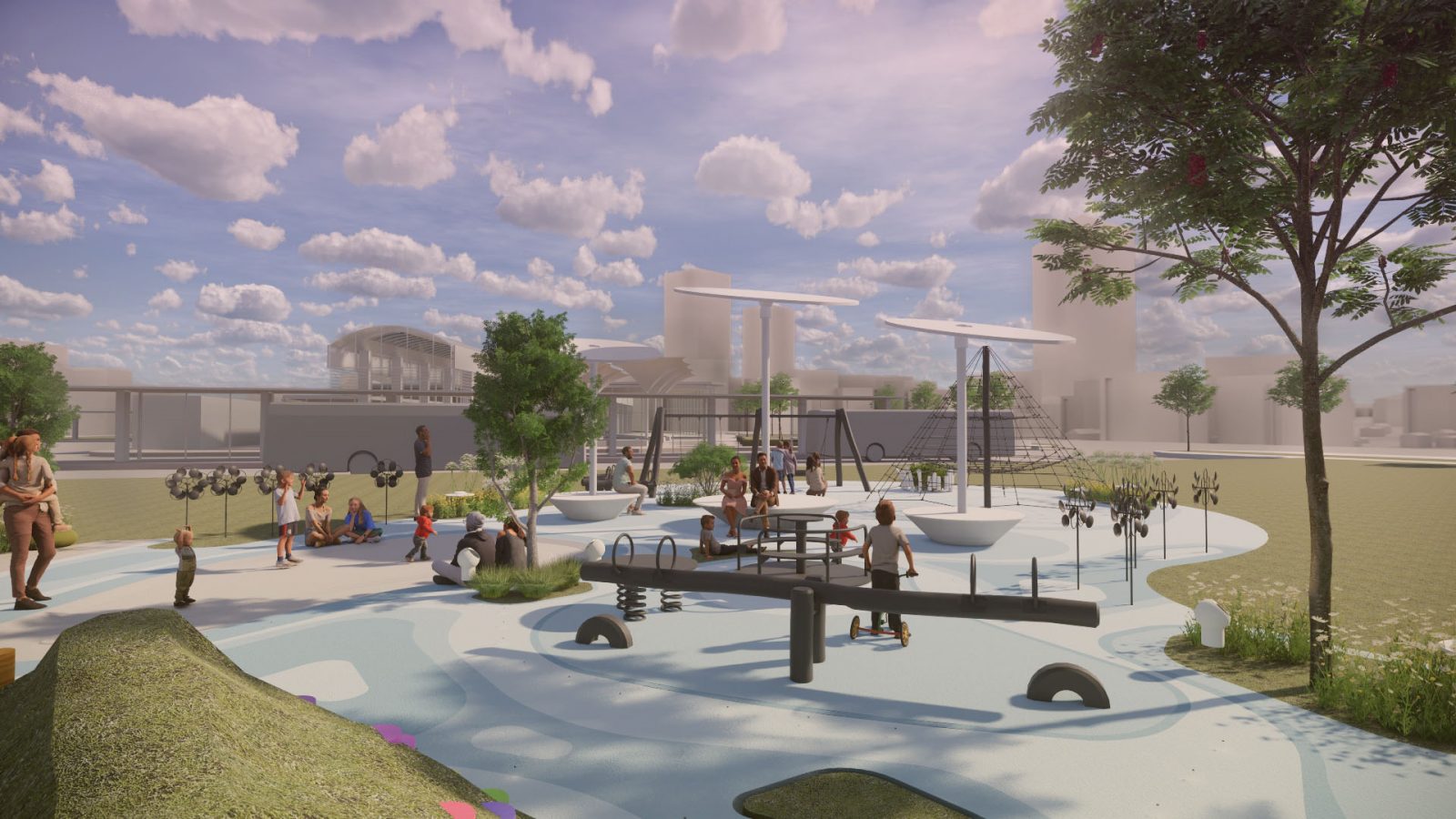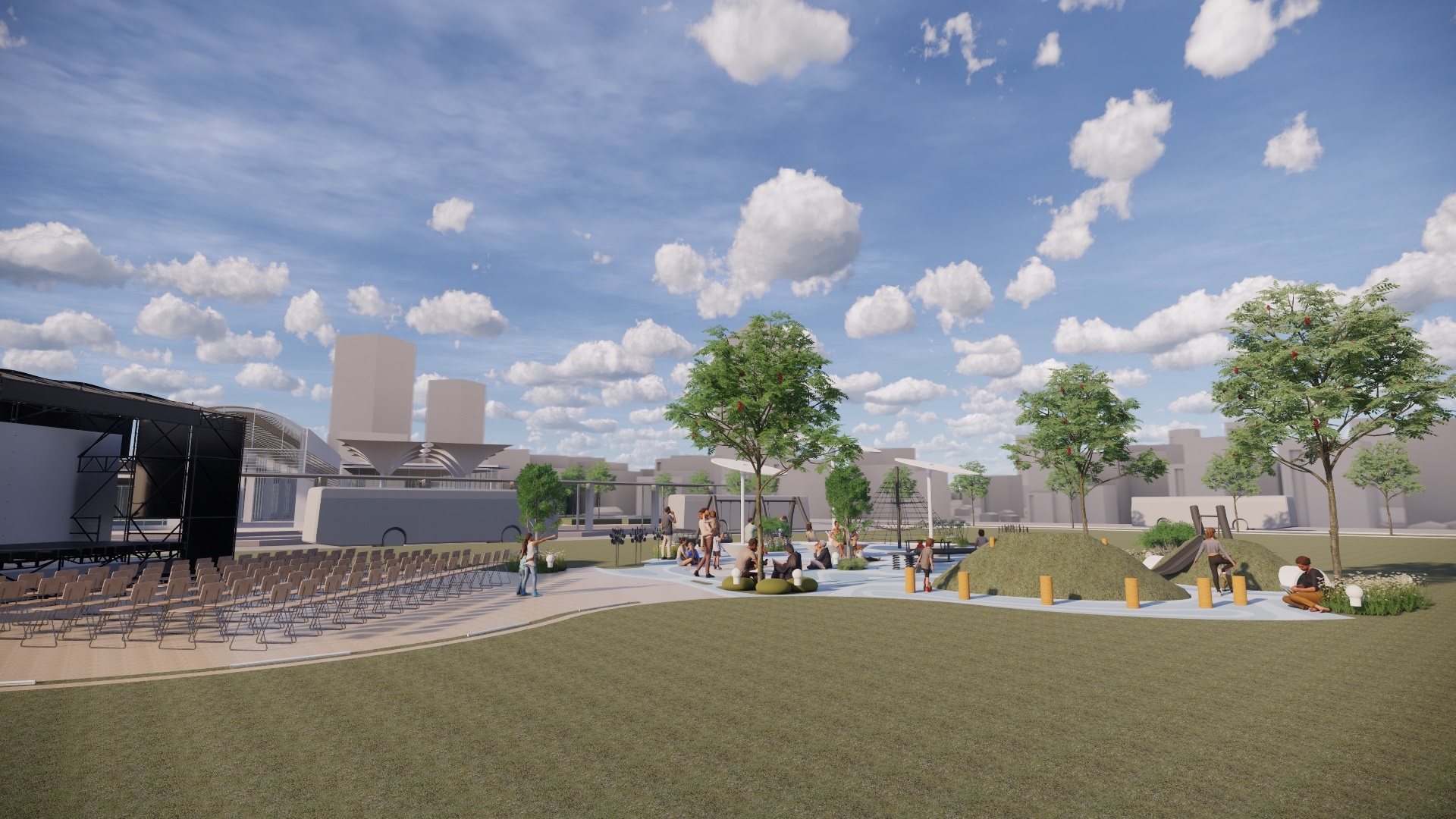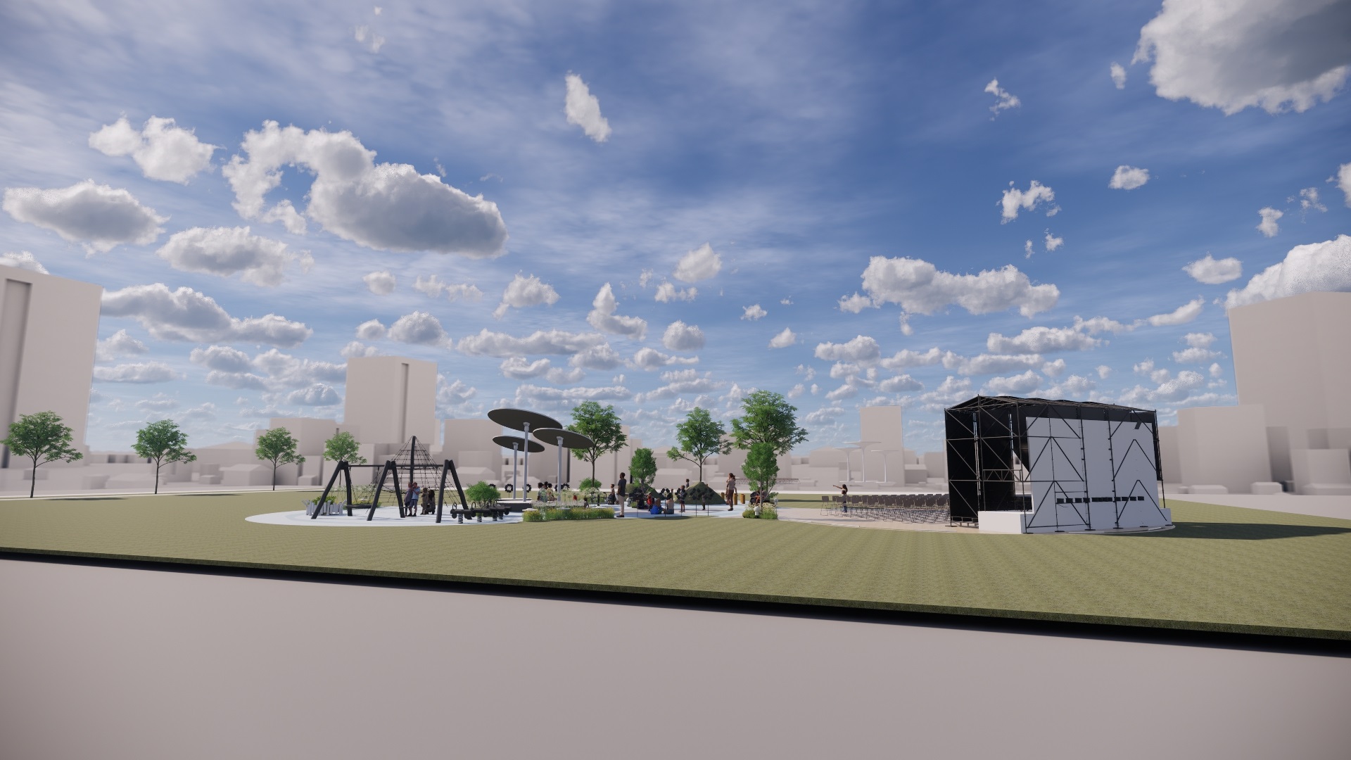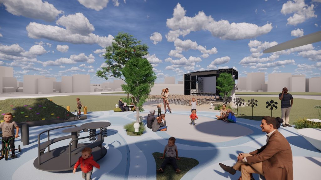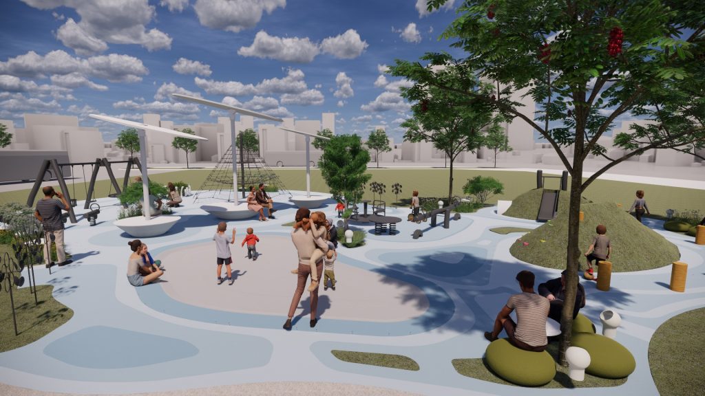 Lấy cảm hứng từ chính thành phố bên sông – chủ đề sông nước. Ý tưởng của em là tạo nên một khu vui chơi mô phỏng mặt nước và các vùng đất liền.