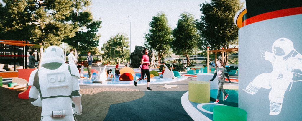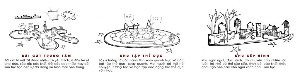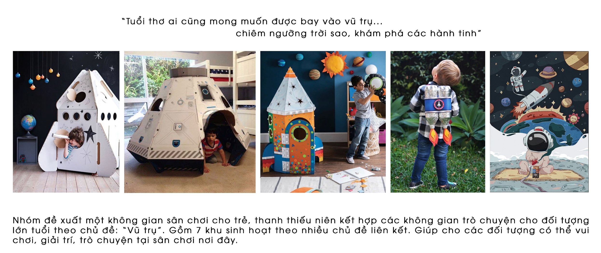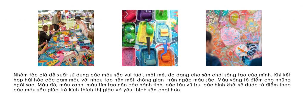 Ý tưởng của nhóm xuất phát từ hình ảnh vũ trụ, trẻ khi còn nhỏ luôn có mơ ước chinh phục vũ trụ, khám phá những vì sao và học hỏi những kiến thức từ đấy. Nhóm khơi gợi những đường nét của vũ trụ để hình thành một không gian vui chơi sáng tạo cho trẻ.