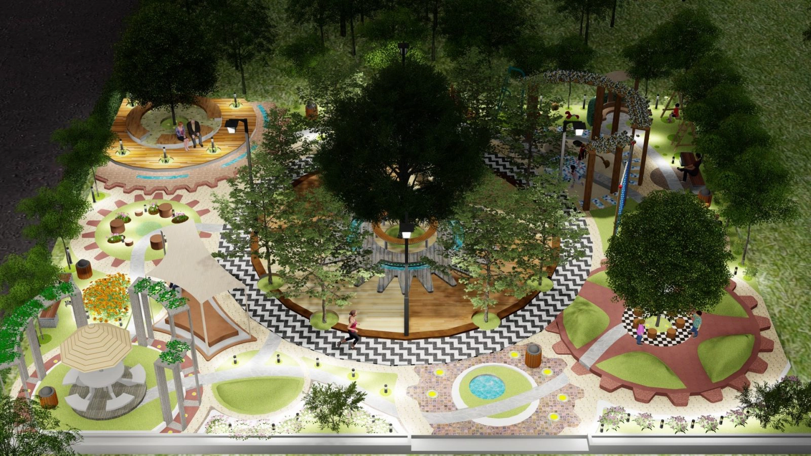 Việc bố trí hệ thống đèn chiếu sáng vừa phục vụ nhu cầu sử dụng của mọi người vào ban đêm vừa thể hiện được ý tưởng điểm nhấn cho 4 múi giờ trong ngày (12h-3h-6h-9h) trên mặt bằng của khu trung tâm. Bên cạnh đó có bố trí thêm đài phun nước nhỏ ở lối tiếp cận chính và các rãnh nước trồng cây thủy sinh nhỏ trong khu trung tâm nhằm tăng vẻ đẹp cho cảnh quan khu vực.