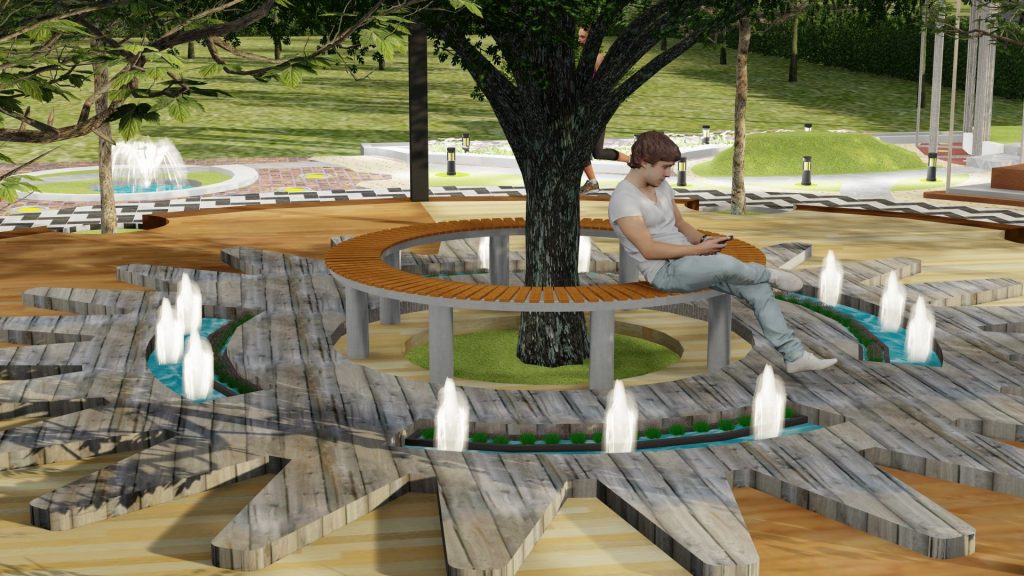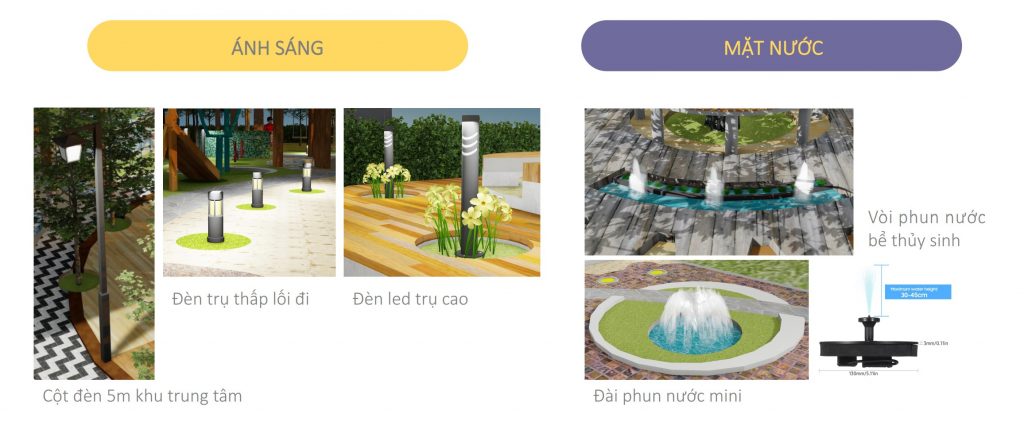 Việc bố trí hệ thống đèn chiếu sáng vừa phục vụ nhu cầu sử dụng của mọi người vào ban đêm vừa thể hiện được ý tưởng điểm nhấn cho 4 múi giờ trong ngày (12h-3h-6h-9h) trên mặt bằng của khu trung tâm. Bên cạnh đó có bố trí thêm đài phun nước nhỏ ở lối tiếp cận chính và các rãnh nước trồng cây thủy sinh nhỏ trong khu trung tâm nhằm tăng vẻ đẹp cho cảnh quan khu vực.