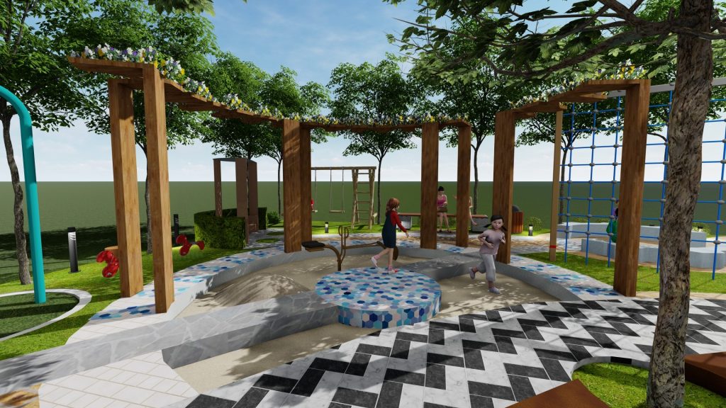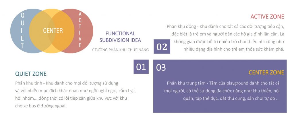 Mục tiêu thiết kế : Playground không chỉ đơn thuần là sân chơi dành cho trẻ em mà đó còn là không gian công cộng, là sự kết nối giữa người với người ở mọi lứa tuổi, sự hòa hợp giữa con người và thiên nhiên, văn hóa sinh hoạt.