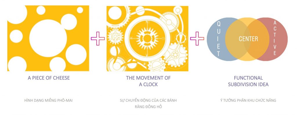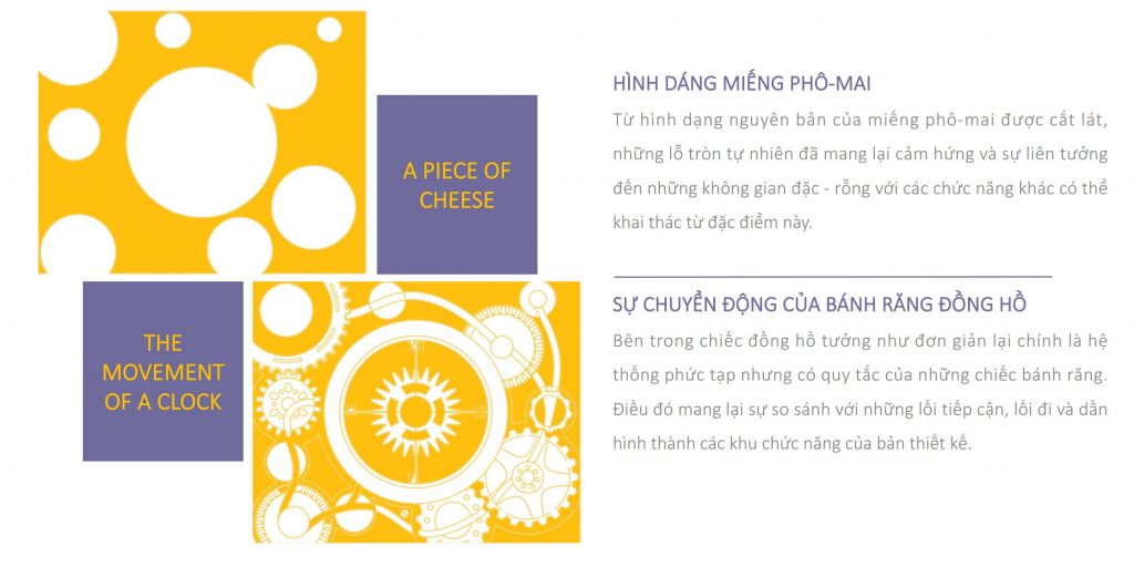 Từ hình dạng nguyên bản của miếng phô-mai được cắt lát, những lỗ tròn tự nhiên đã mang lại cảm hứng và sự liên tưởng đến những không gian đặc – rỗng với các chức năng khác có thể khai thác từ đặc điểm này.