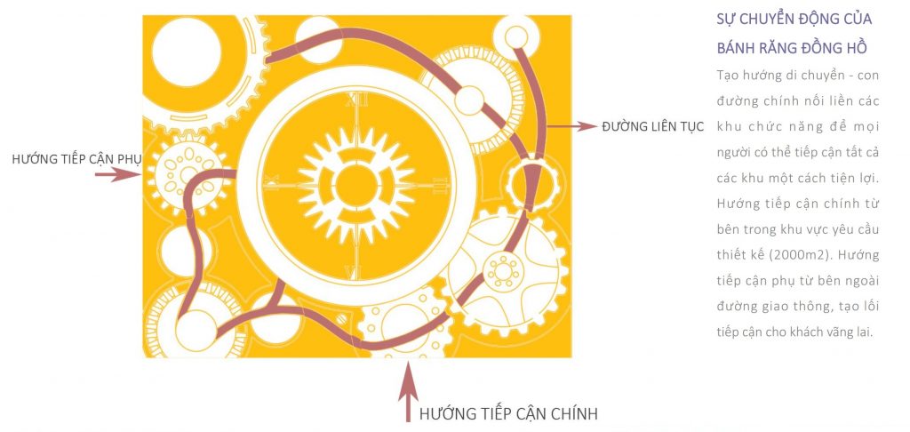 Bên trong chiếc đồng hồ tưởng như đơn giản lại chính là hệ thống phức tạp nhưng có quy tắc của những chiếc bánh răng. Điều đó mang lại sự so sánh với những lối tiếp cận, lối đi và dần hình thành các khu chức năng của bản thiết kế.