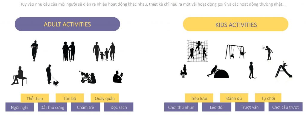 Tùy vào nhu cầu của mỗi người sẽ diễn ra nhiều hoạt động khác nhau, thiết kế chỉ nêu ra một vài hoạt động gợi ý và các hoạt động thường nhật…