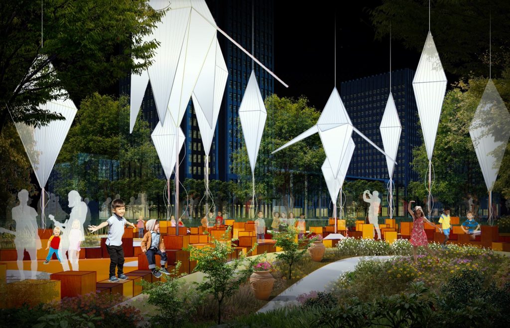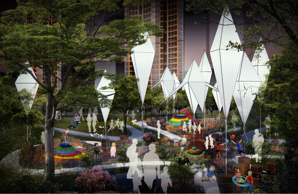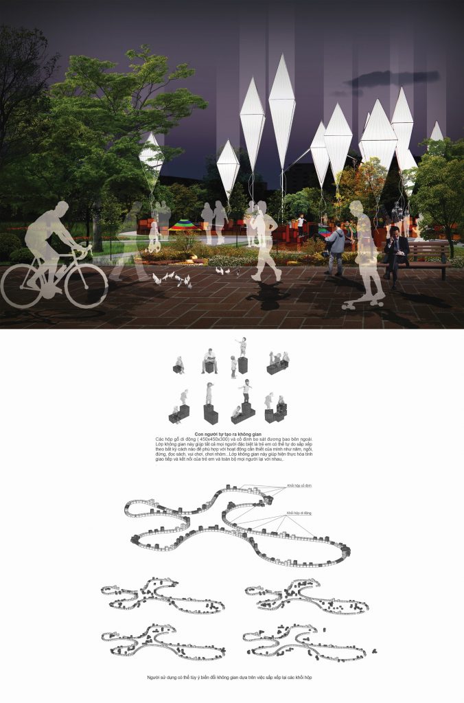 Với tổng thê khu dân cư, công viên là nơi mọi con đường đều đi qua, nơi mỗi ngày người dân cư trú tại đây đều nhìn thấy mỗi sáng sớm hay chiều về. Tân dụng lợi thế đó, kiến tạo một điểm nhấn có độ cao vừa đủ, vượt lên một phần so với các hàng cây tại công viên, điểm nhấn được cách điệu từ ký ức về mỗi buổi chiều ở thôn quê có những đứa trẻ ngày nào cũng rủ nhau ra đồng thả diều.