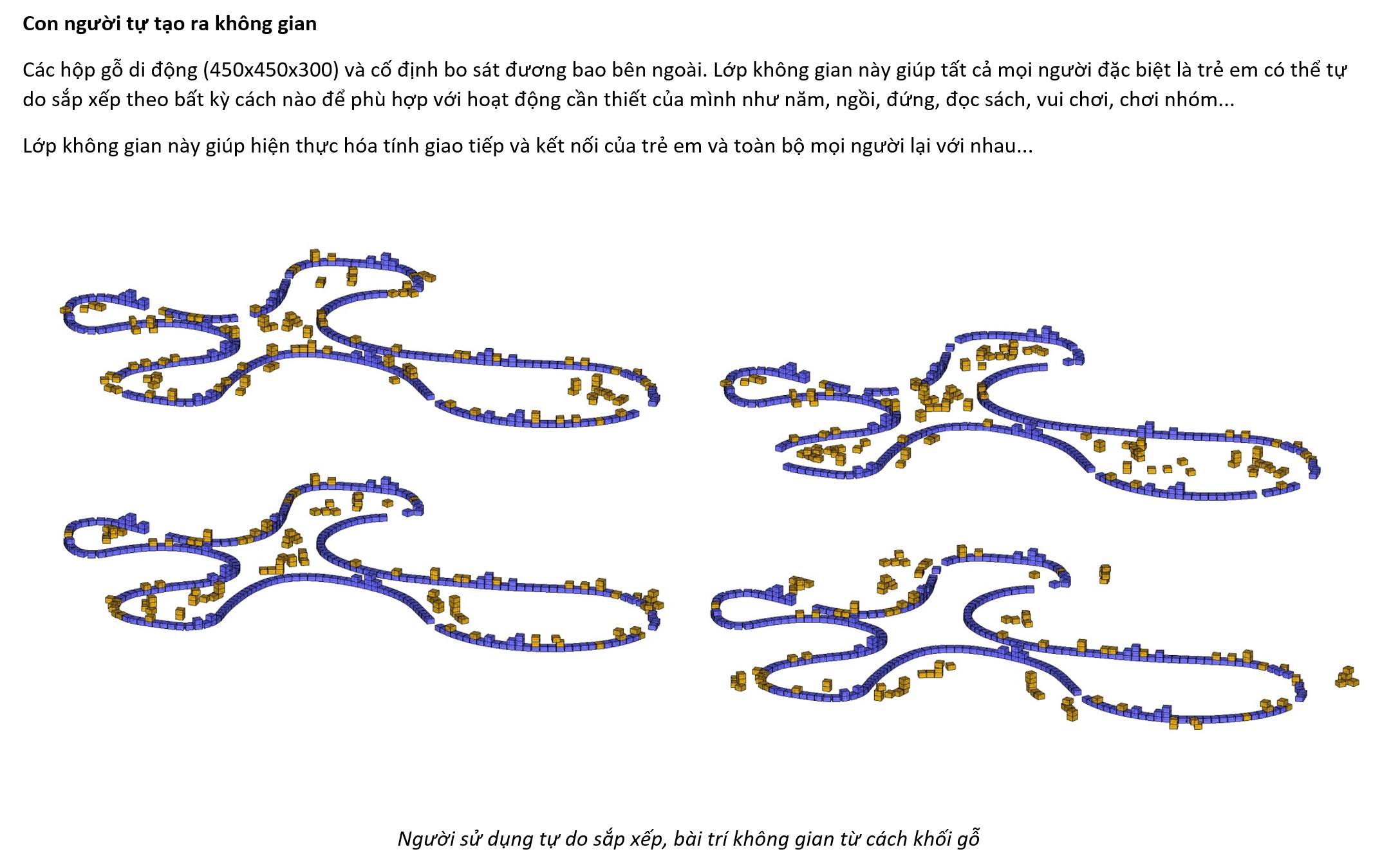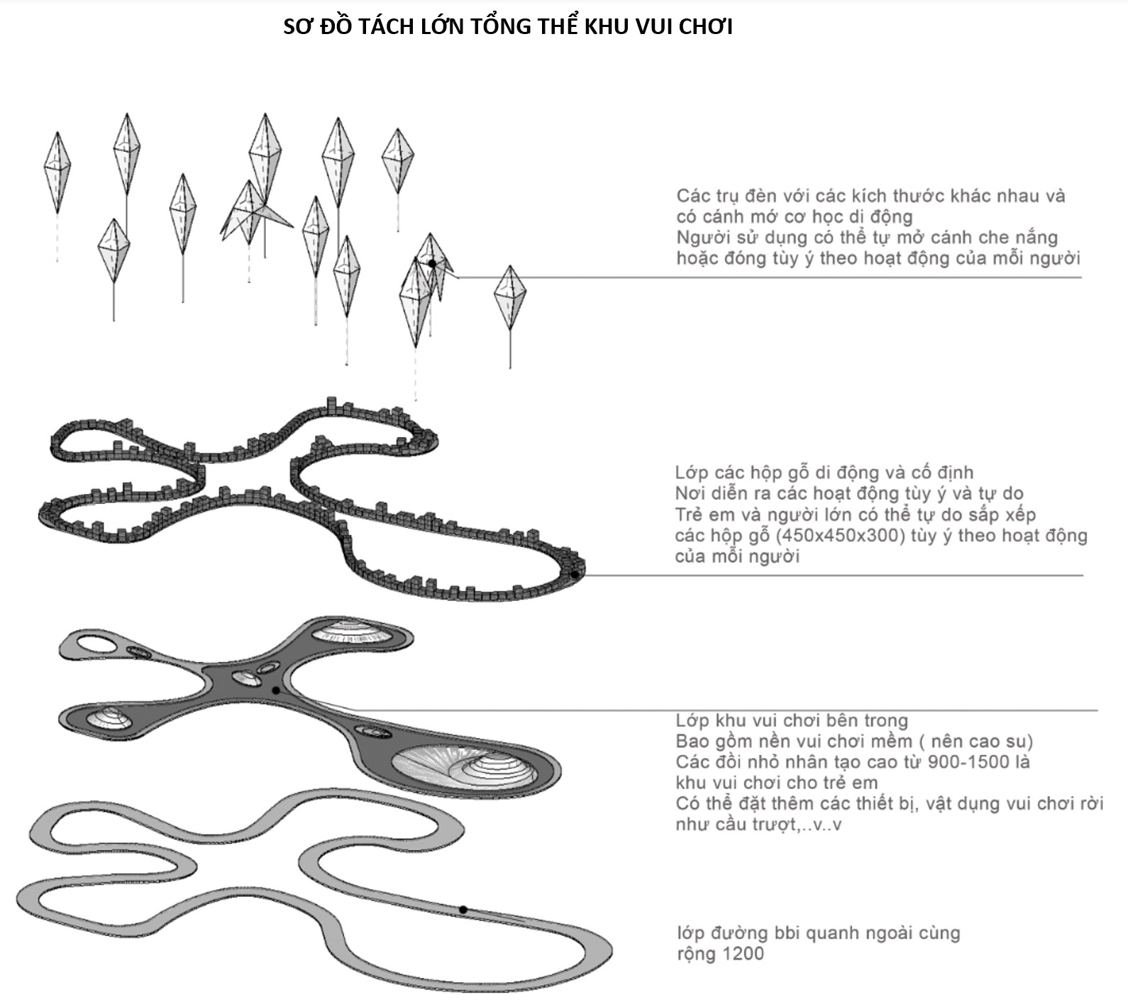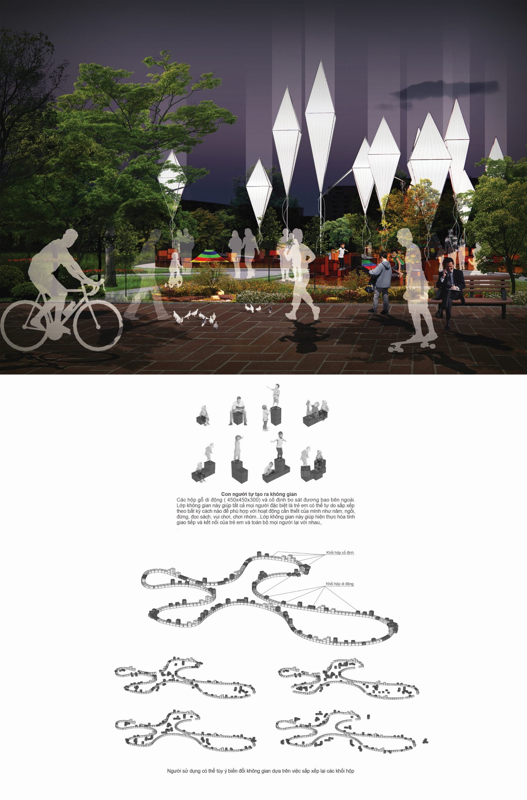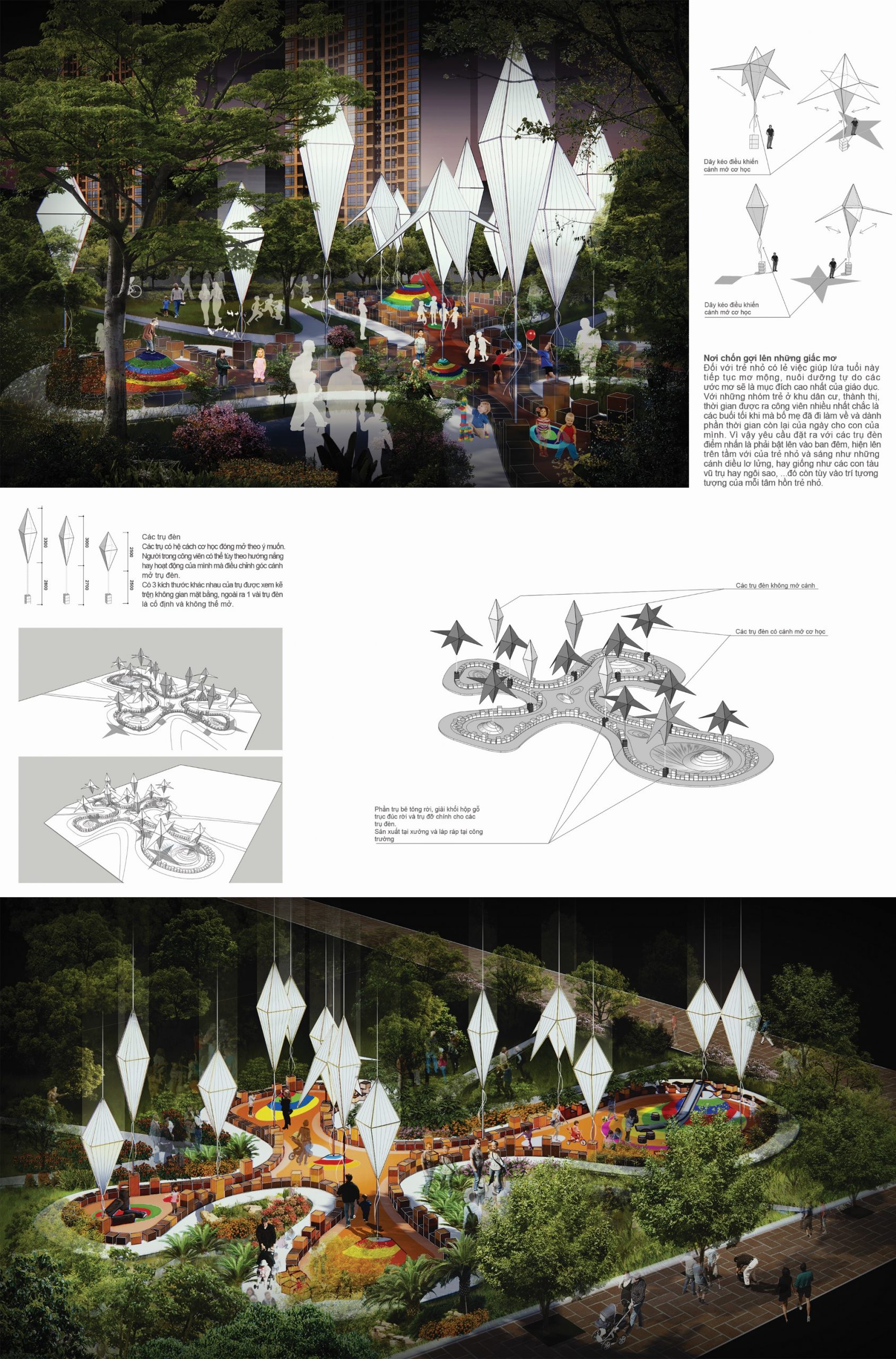 Đối với trẻ nhỏ có lẻ việc giúp lứa tuổi này tiếp tục mơ mộng, nuôi dưỡng tự do các ước mơ sẽ là mục đích cao nhất của giáo dục. Với những nhóm trẻ ở khu dân cư, thành thị, thời gian được ra công viên nhiều nhất chắc là các buối tối khi mà bố mẹ đã đi làm về và dành phần thời gian còn lại của ngày cho con của mình. Vì vậy yêu cầu đặt ra với các trụ đèn điểm nhấn là phải bật lên vào ban đêm, hiện lên trên tầm với của trẻ nhỏ và sáng như những cánh diều lơ lửng, hay giống như các con tàu vũ trụ hay ngôi sao… đó còn tùy vào trí tưởng tượng của mỗi tâm hồn trẻ nhỏ. Thiết kế mong muốn khơi gợi nên trí tưởng tượng và trí tò mò của nhóm trẻ.