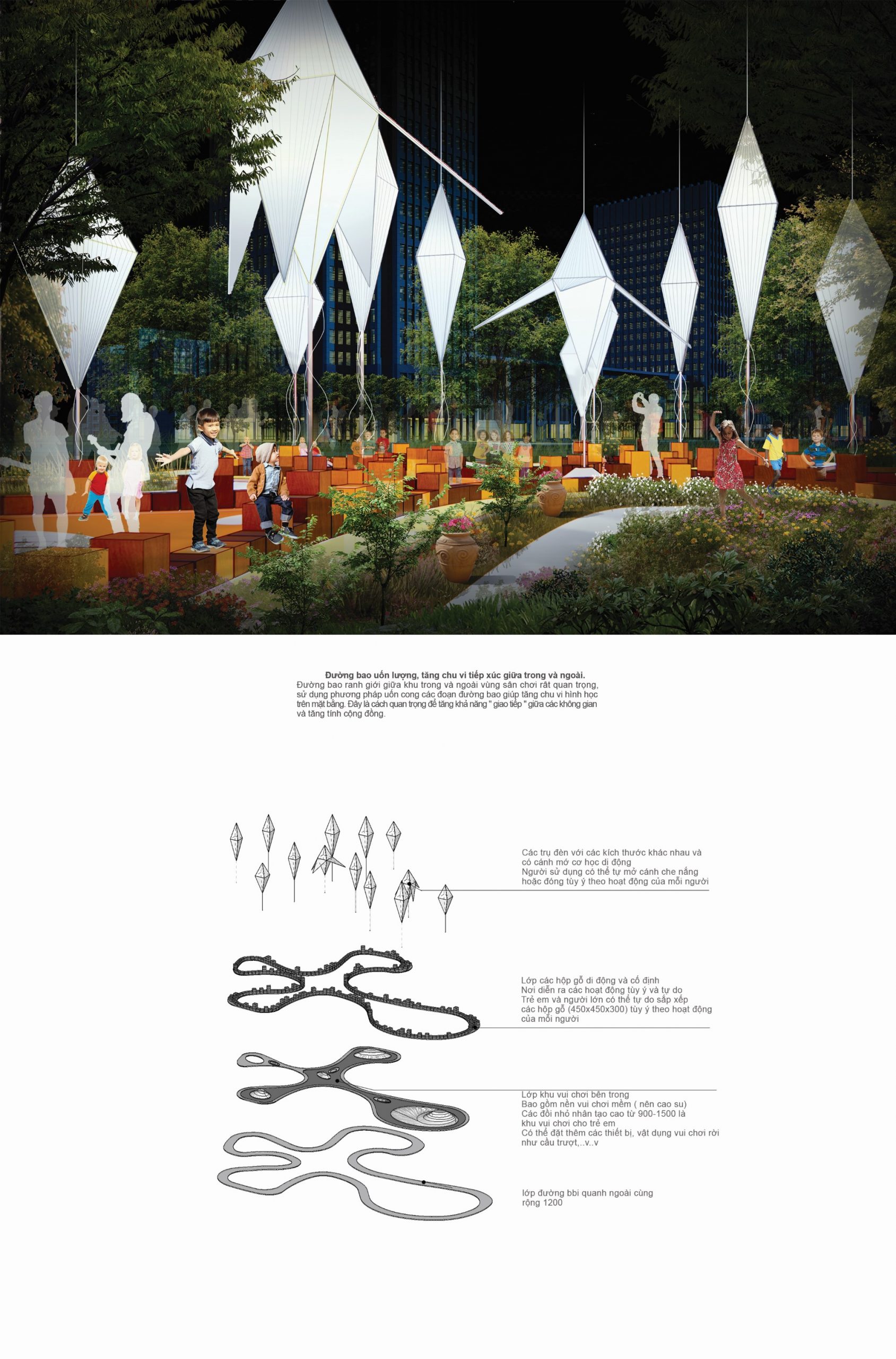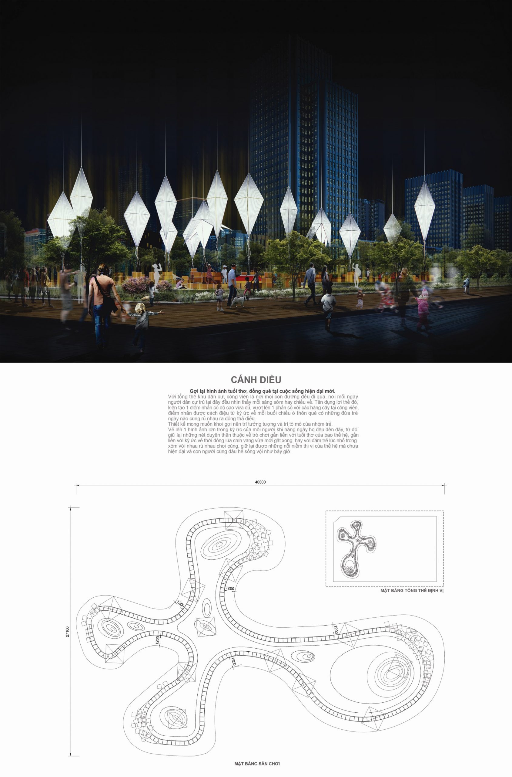 Với tổng thê khu dân cư, công viên là nơi mọi con đường đều đi qua, nơi mỗi ngày người dân cư trú tại đây đều nhìn thấy mỗi sáng sớm hay chiều về. Tân dụng lợi thế đó, kiến tạo một điểm nhấn có độ cao vừa đủ, vượt lên một phần so với các hàng cây tại công viên, điểm nhấn được cách điệu từ ký ức về mỗi buổi chiều ở thôn quê có những đứa trẻ ngày nào cũng rủ nhau ra đồng thả diều.