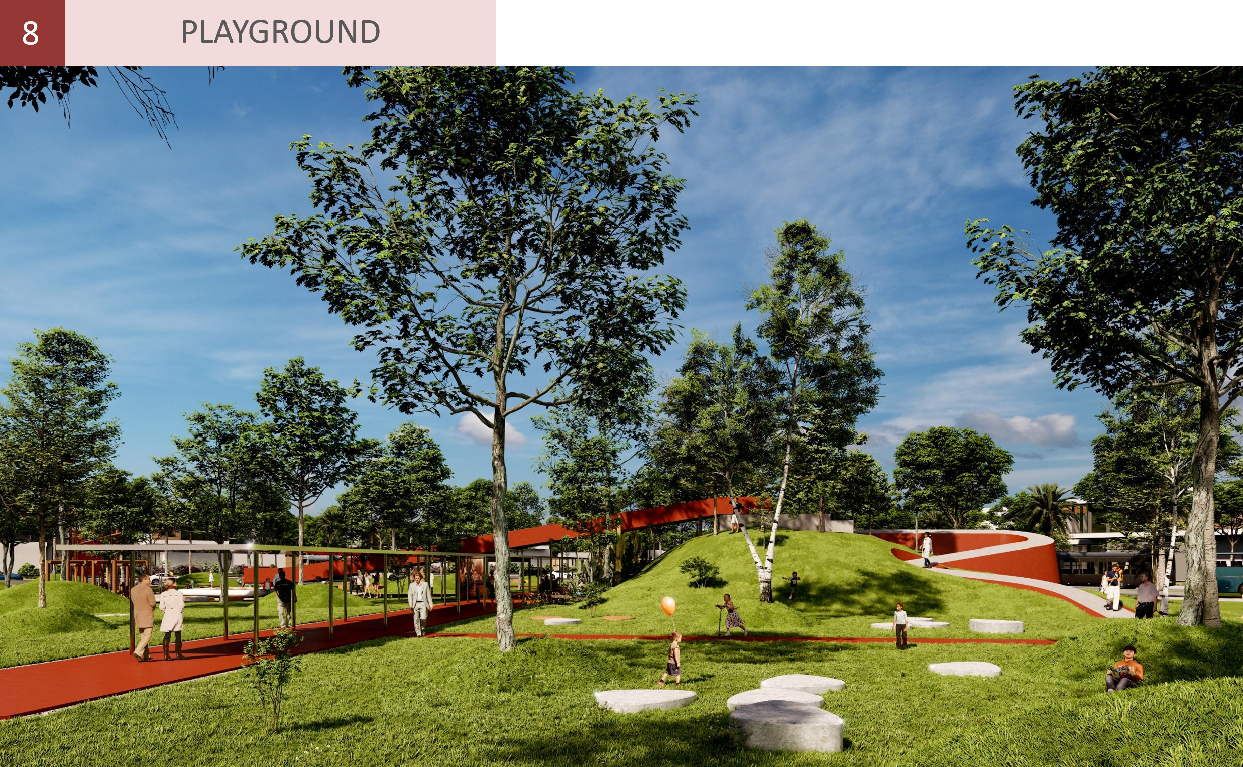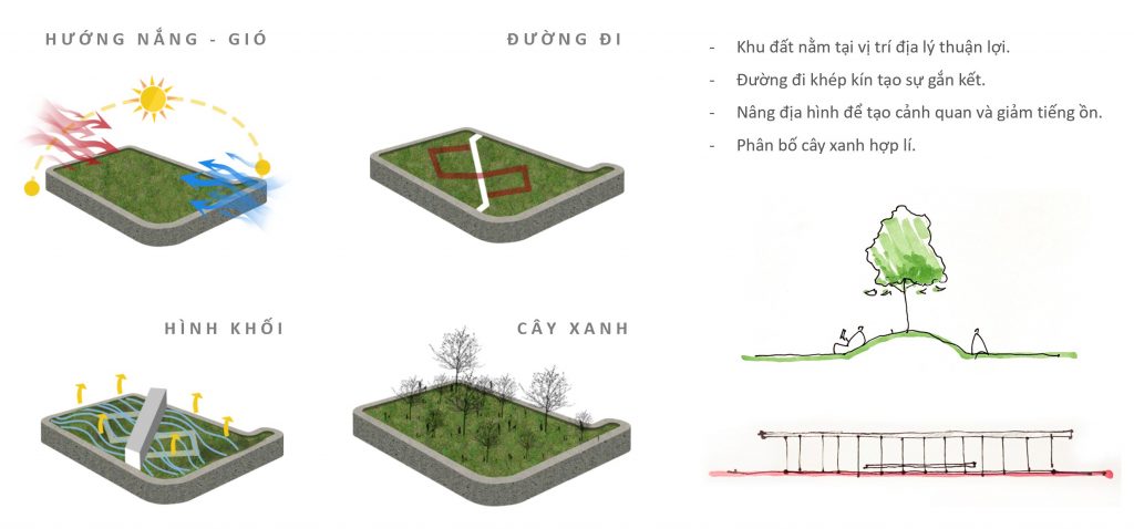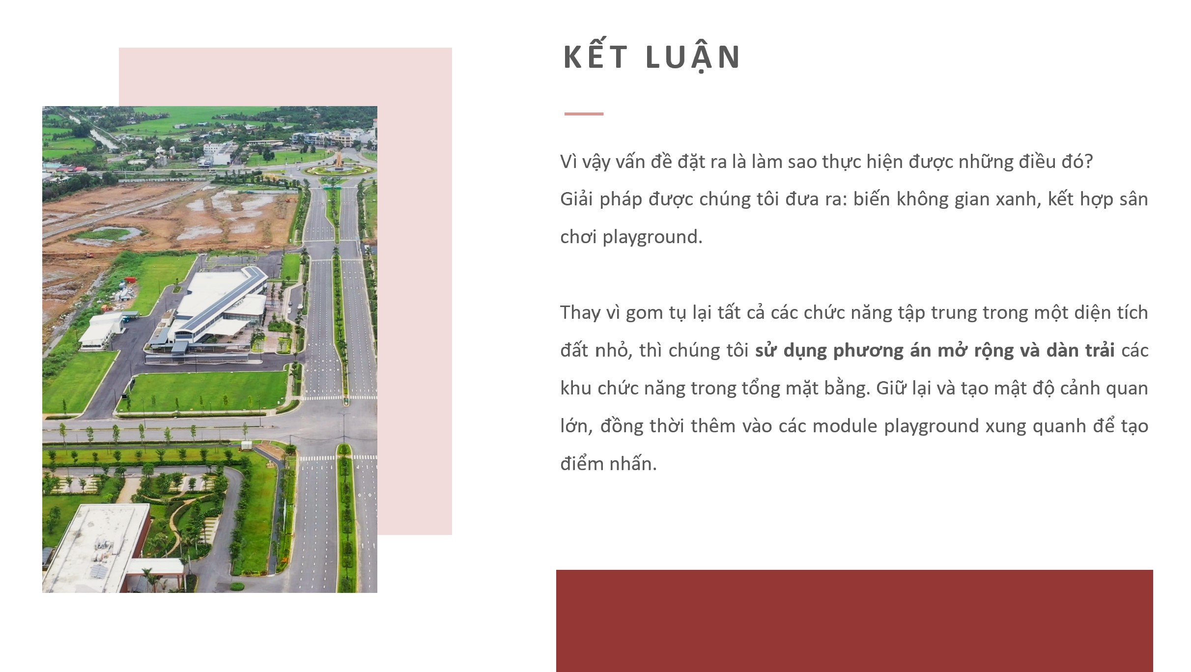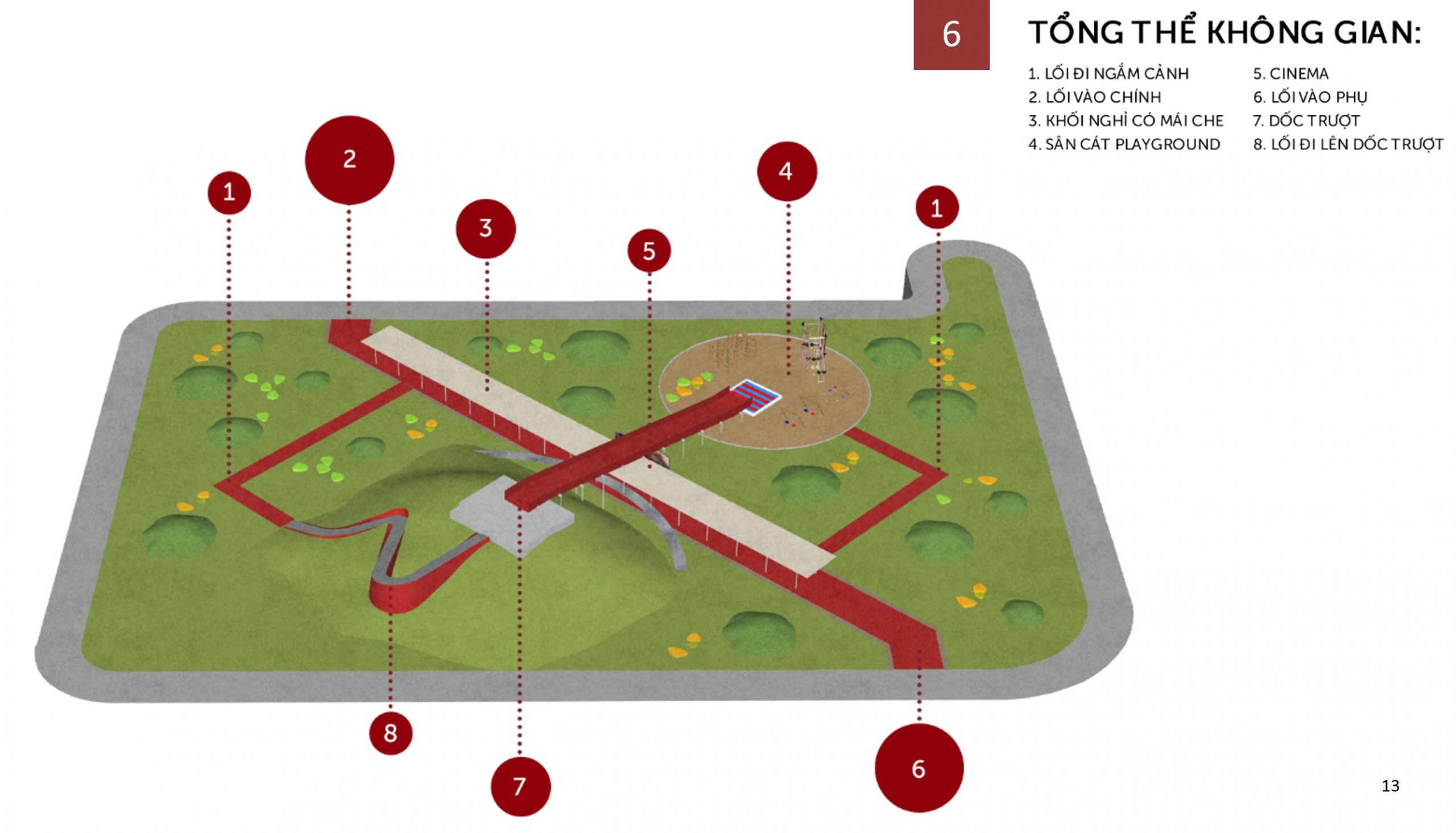 Thay vì gom tụ lại tất cả các chức năng tập trung trong một diện tích đất nhỏ, thì chúng tôi sử dụng phương án mở rộng và dàn trải các khu chức năng trong tổng mặt bằng. Giữ lại và tạo mật độ cảnh quan lớn, đồng thời thêm vào các module playground xung quanh để tạo điểm nhấn.