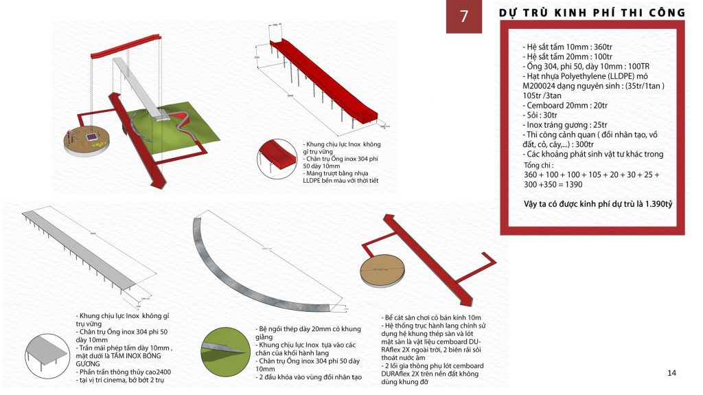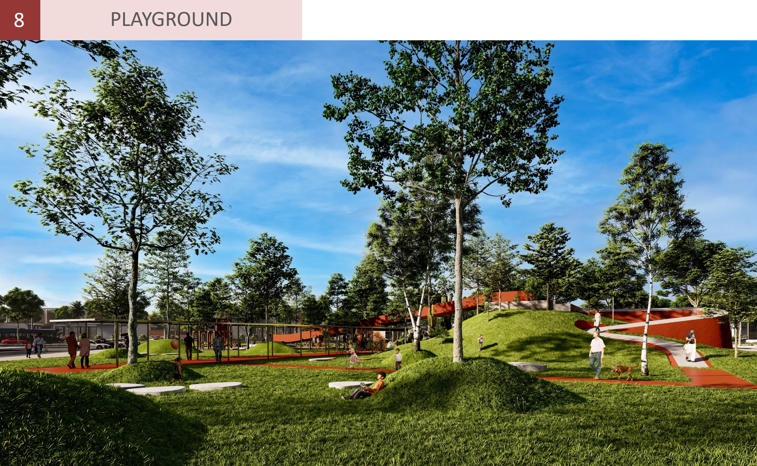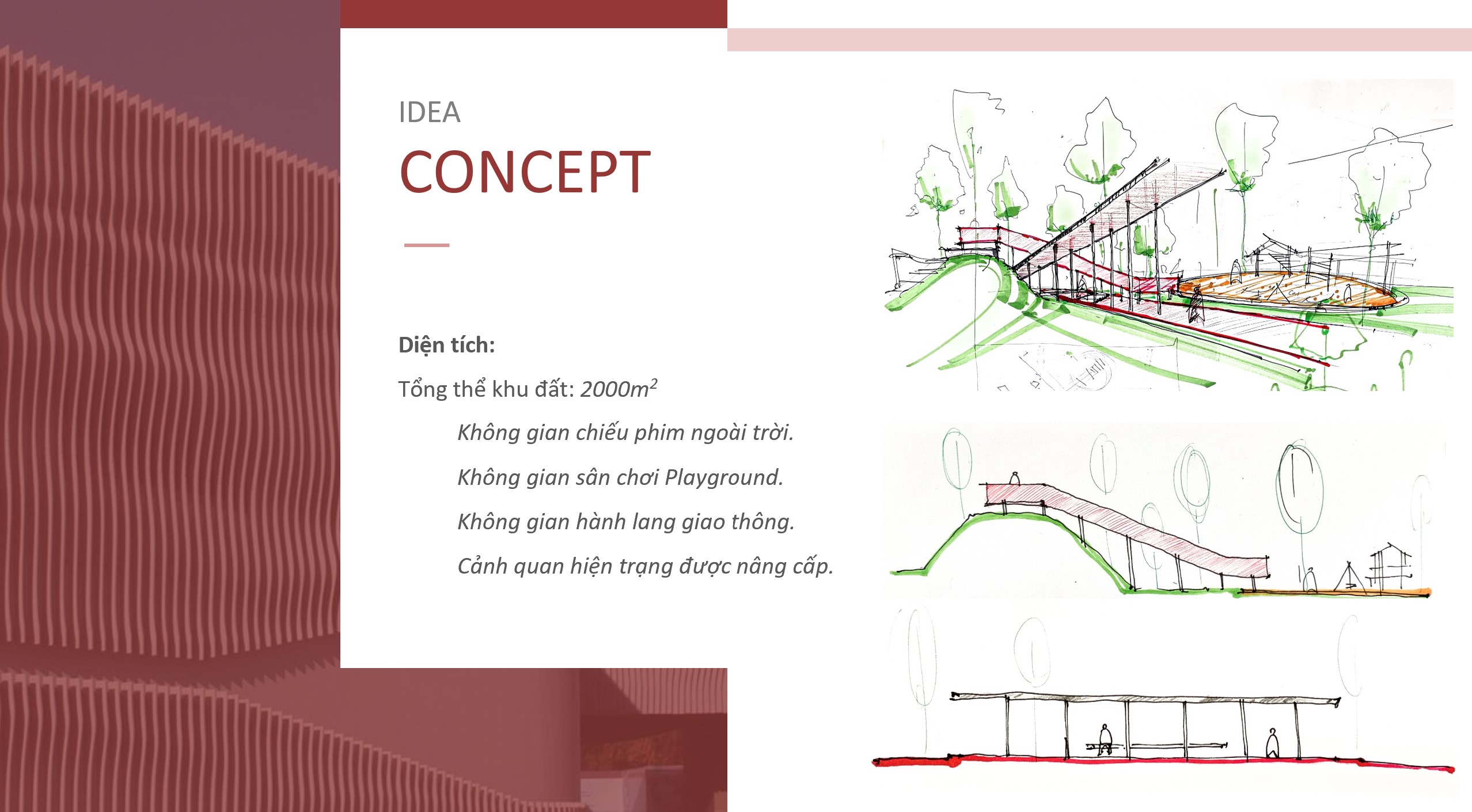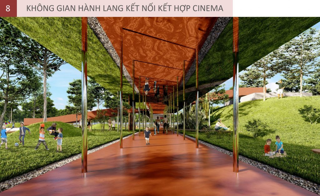Thay vì gom tụ lại tất cả các chức năng tập trung trong một diện tích đất nhỏ, thì chúng tôi sử dụng phương án mở rộng và dàn trải các khu chức năng trong tổng mặt bằng. Giữ lại và tạo mật độ cảnh quan lớn, đồng thời thêm vào các module playground xung quanh để tạo điểm nhấn.