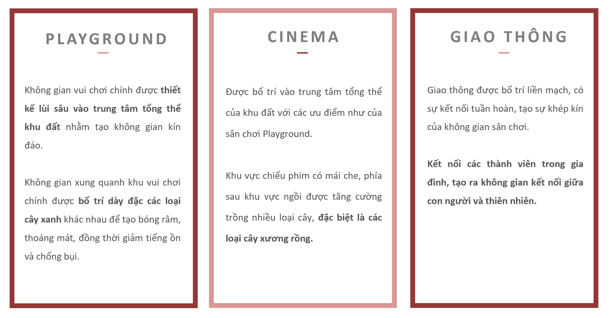 Giao thông được bố trí liền mạch, có sự kết nối tuần hoàn, tạo sự khép kín của không gian sân chơi. Kết nối các thành viên trong gia đình, tạo ra không gian kết nối giữa con người và thiên nhiên.