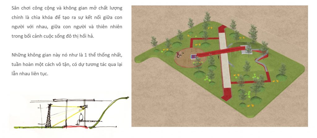 Vì vậy vấn đề đặt ra là làm sao thực hiện được những điều đó? Giải pháp được chúng tôi đưa ra: biến không gian xanh, kết hợp sân chơi playground.