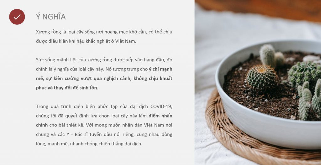 Trong quá trình diễn biến phức tạp của đại dịch COVID-19, chúng tôi đã quyết định lựa chọn loại cây này làm điểm nhấn chính cho bài thiết kế. Với mong muốn nhân dân Việt Nam nói chung và các Y – Bác sĩ tuyến đầu nói riêng, cùng nhau đồng lòng, mạnh mẽ, nhanh chóng chiến thắng đại dịch.