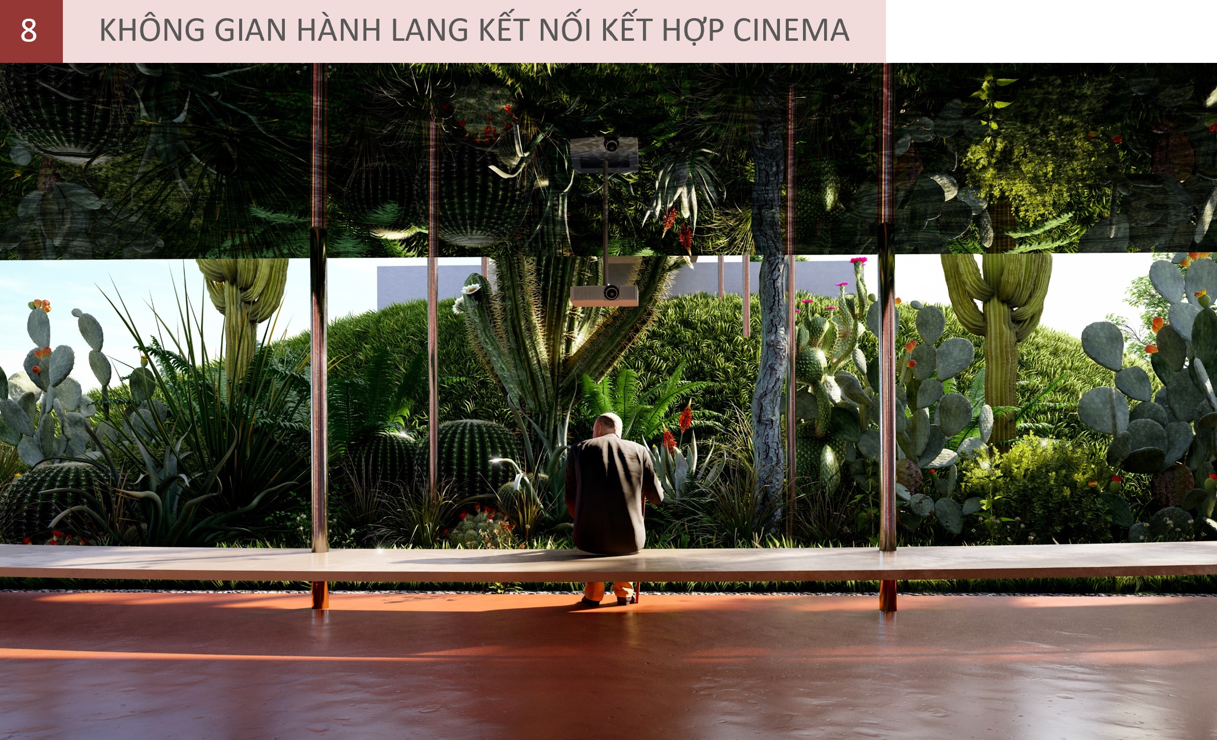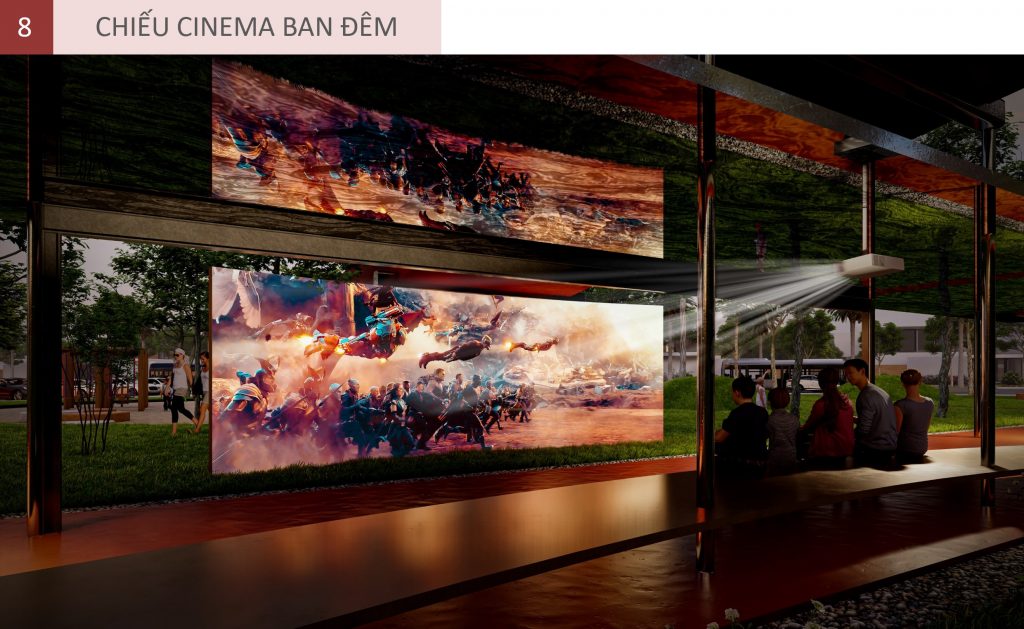 Được bố trí vào trung tâm tổng thể của khu đất với các ưu điểm như của sân chơi Playground. Khu vực chiếu phim có mái che, phía sau khu vực ngồi được tăng cường trồng nhiều loại cây, đặc biệt là các loại cây xương rồng.