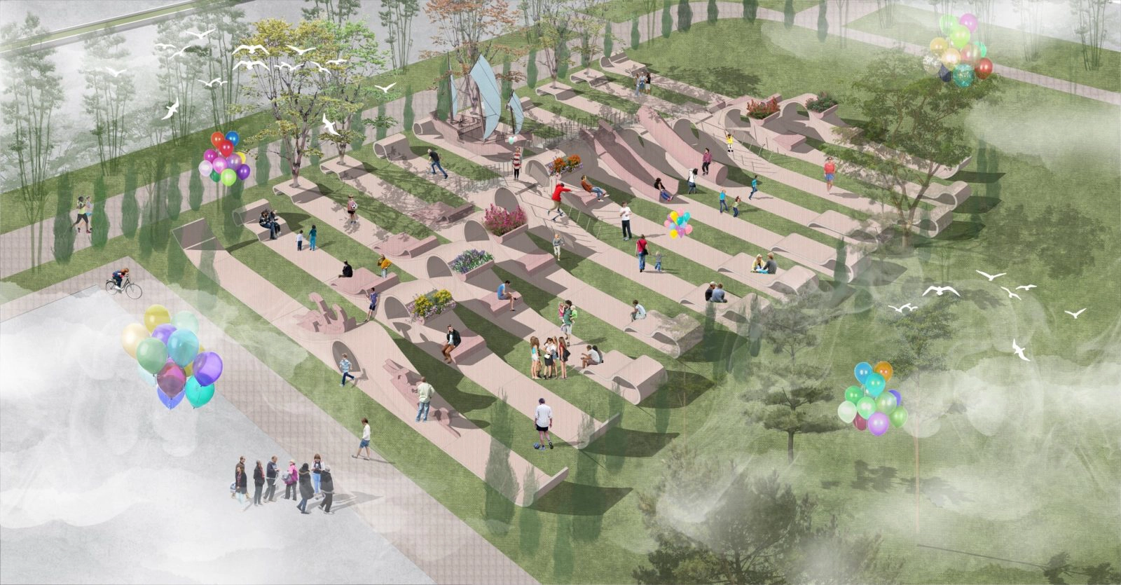Sử dụng các tấm ván gỗ và ghép chúng lại với nhau để tạo hình chuyển động của cơn sóng, đồng thời bố trí các tiện ích trò chơi, ghế nghỉ và cây xanh. Các đường thẳng song song đan xen giữa nền cỏ và gỗ, tất cả tạo nên sự sinh động đầy màu sắc hòa hợp với thiên nhiên.