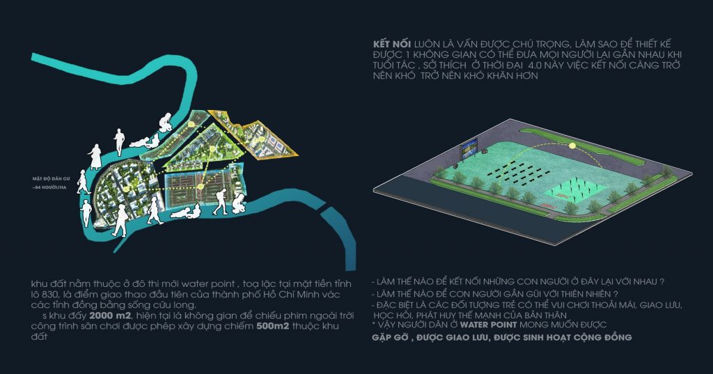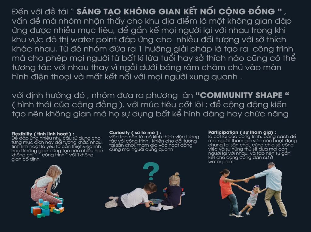 Đến với đề tài “sáng tạo không gian kết nối cộng đồng”, vấn đề mà nhóm nhận thấy cho khu địa điểm là một không gian đáp ứng được nhiều mục tiêu, để gắn kết mọi người lại với nhau trong khi khu vực đô thị Waterpoint đáp ứng cho nhiều đối tượng với sở thích khác nhau. Từ đó nhóm đưa ra một hướng giải pháp là tạo ra công trình mà cho phép mọi người từ bất kì lứa tuổi hay sở thích nào cũng có thể tương tác với nhau thay vì ngồi dưới bóng râm chăm chú vào màn hình điện thoại và mất kết nối với mọi người xung quanh.