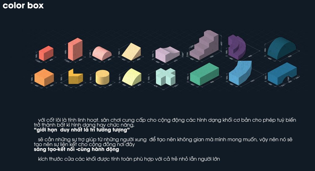 GREEN BOX: tạo ra để nhằm tăng cường mảng xanh cho không gian mà vẫn giữ được tính linh hoạt và không thay đổi tới hiện trạng của khu đất, cũng là để con người kết nối thiên nhiên nhiều hơn.