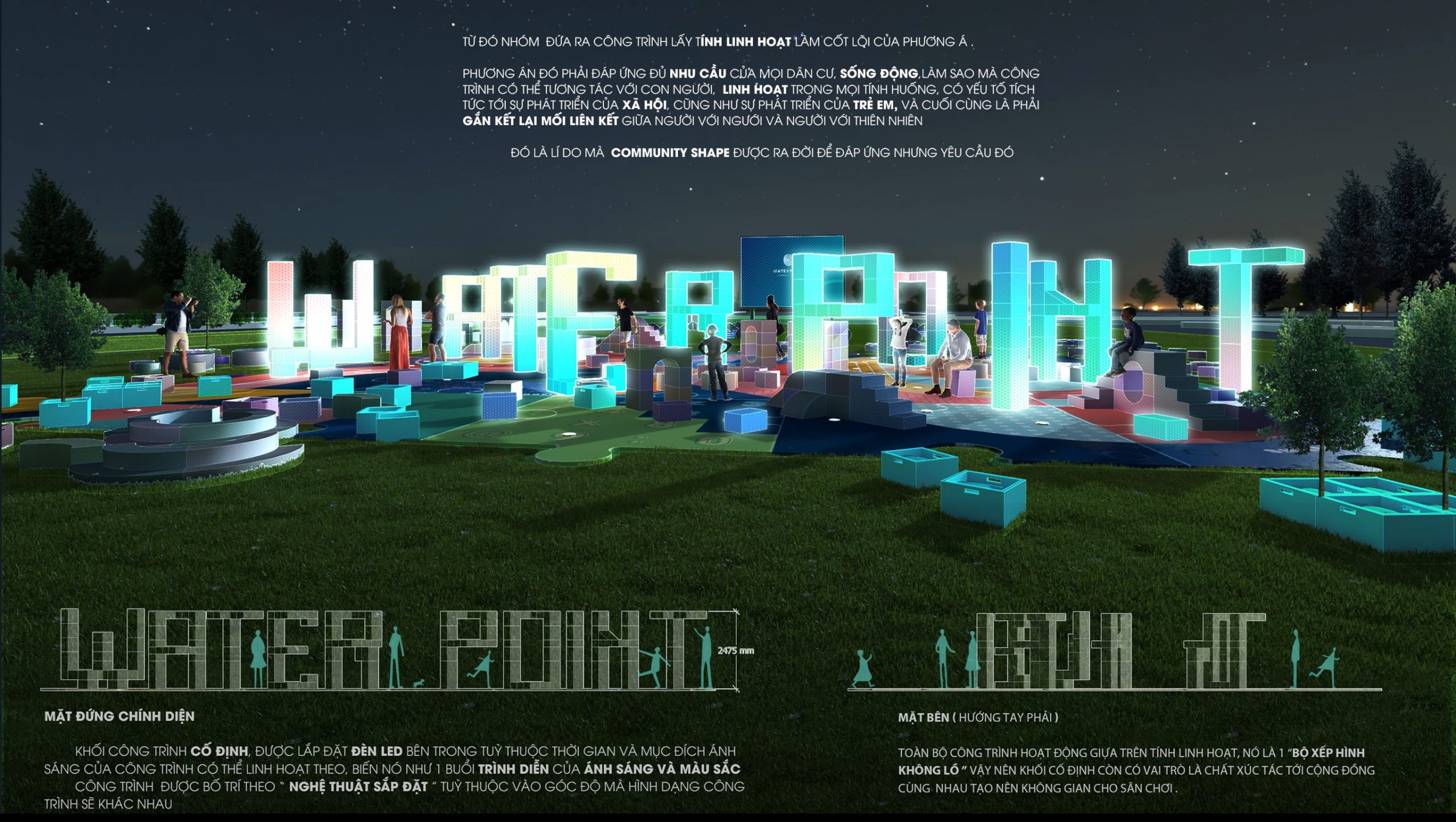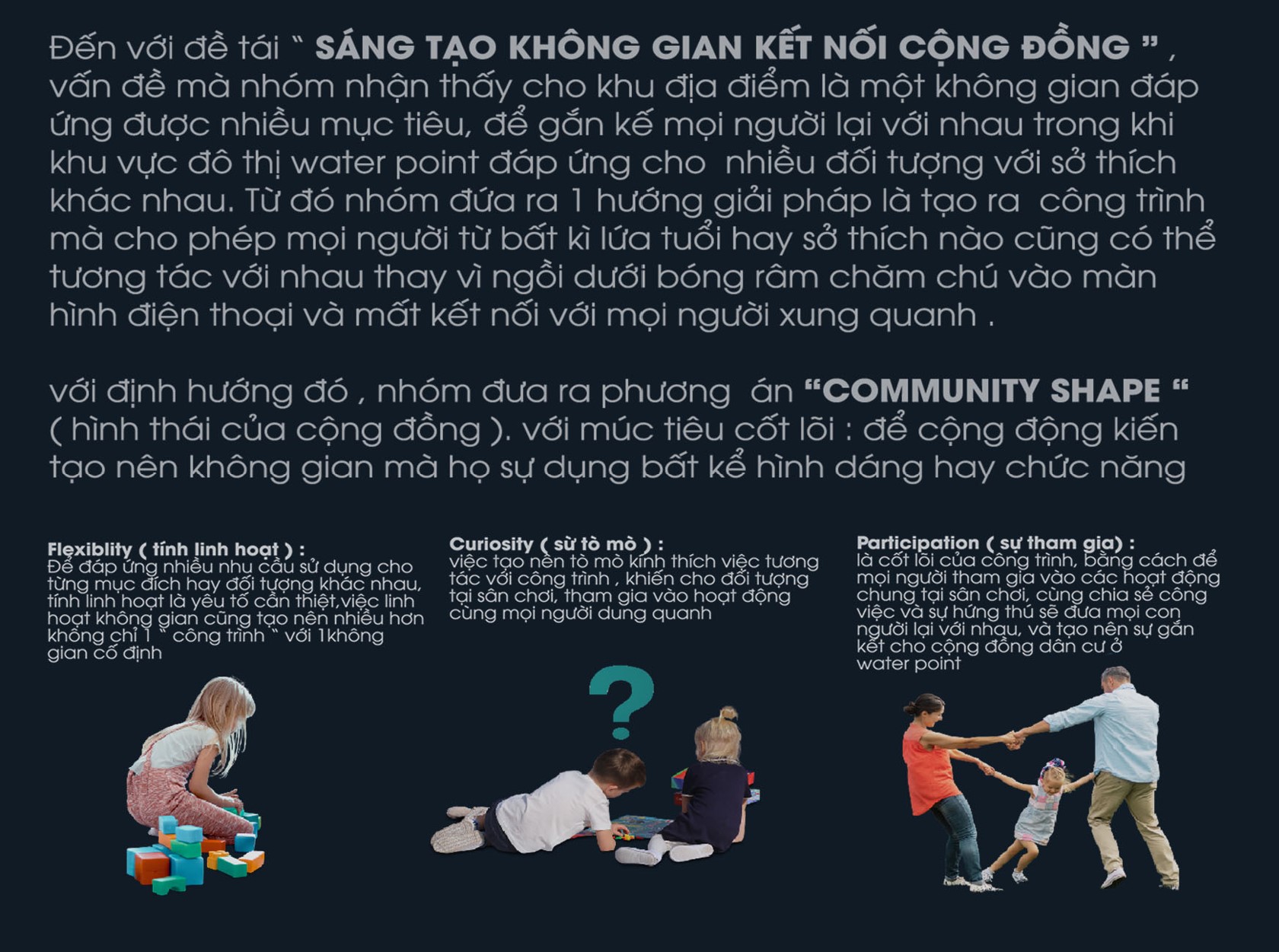 Là 1 phương án đó phải đáp ứng đủ những nhu cầu của mọi cư dân, sống động, làm sao công trình có thể tương tác với con người, linh hoạt trong mọi tình huống. Có yếu tố tích cực tới sự phát triển của xã hội, cũng như sự phát triển của trẻ em, và cuối cùng là gắn kết lại mối liên kết giữa người với người và con người với thiên nhiênĐó là lý do mà Comunity shape được ra đời để đáp những ứng nhu cầu đó.