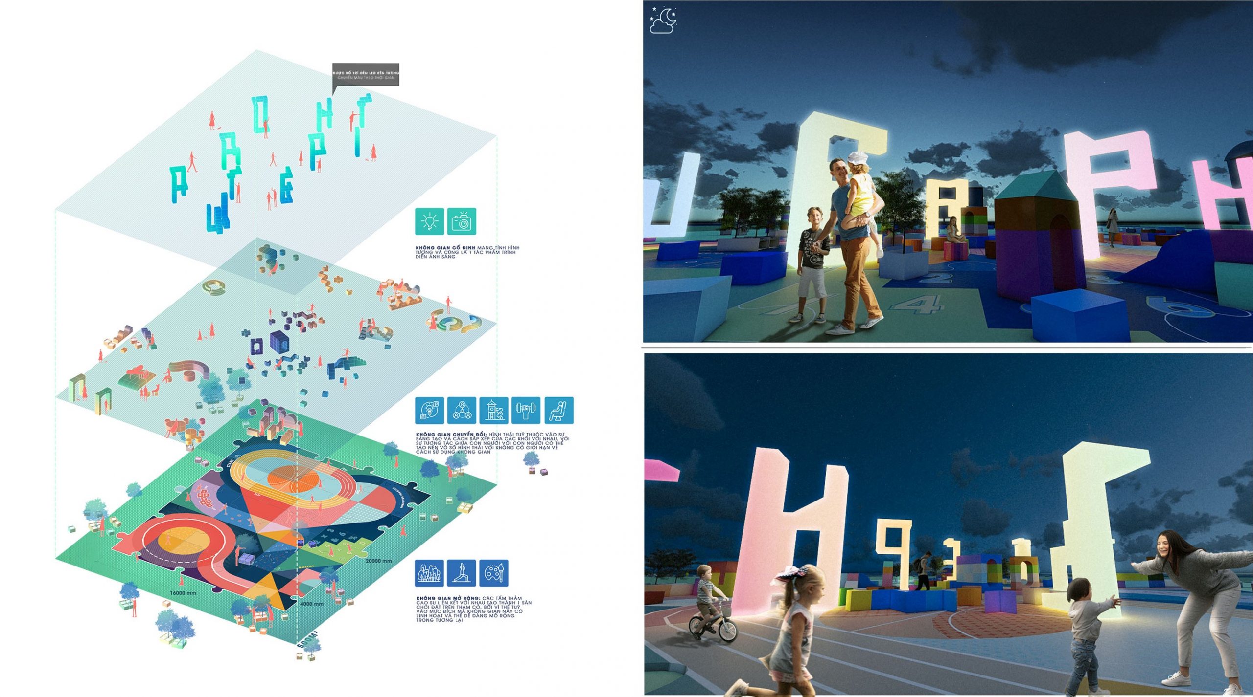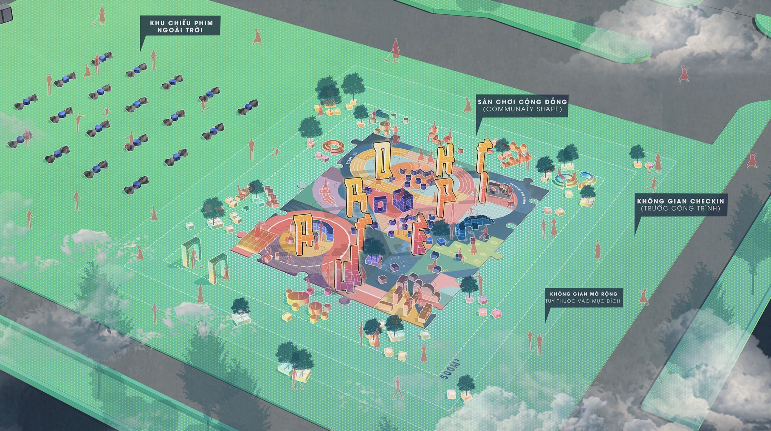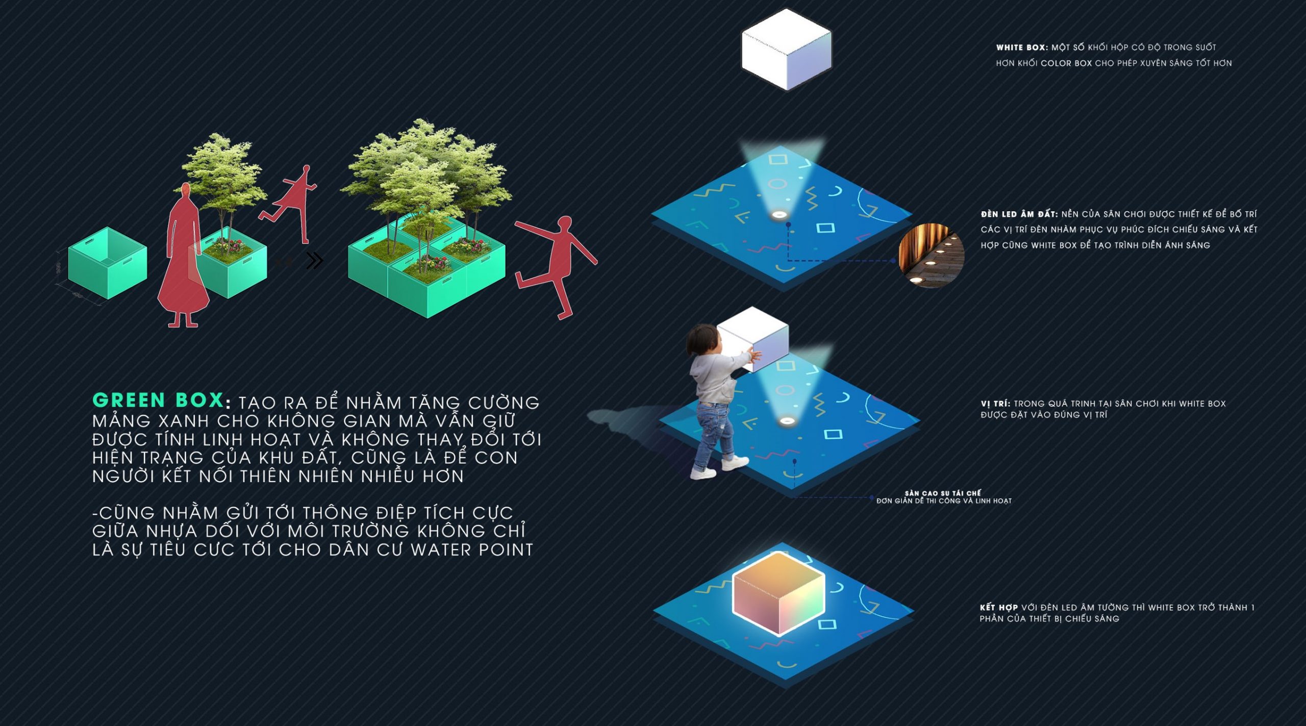 GREEN BOX: tạo ra để nhằm tăng cường mảng xanh cho không gian mà vẫn giữ được tính linh hoạt và không thay đổi tới hiện trạng của khu đất, cũng là để con người kết nối thiên nhiên nhiều hơn.