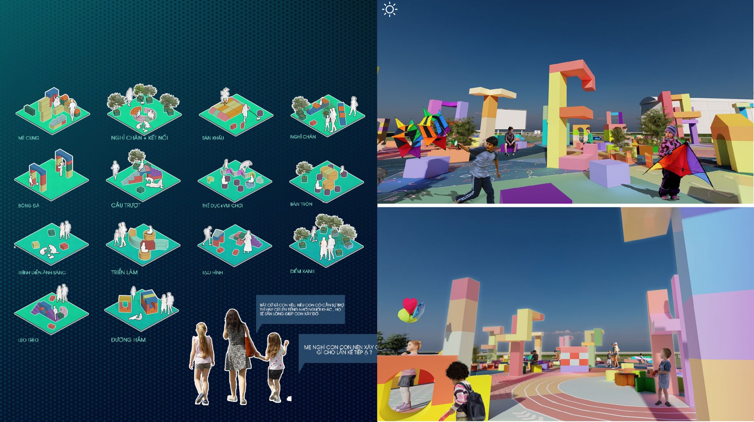 “Làm sao để có thể cộng đồng dân cư tự tạo nên những không gian mà họ mong muốn, không gian mà gia đình cùng nhau tương tác tạo nên kết nối, nơi biến từ người lạ thành người quen, nơi trí tưởng tượng của ko chỉ là trẻ em mà cả người lớn được nuôi dưỡng và thể hiện”