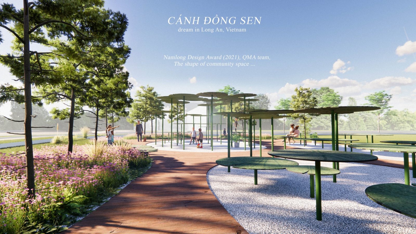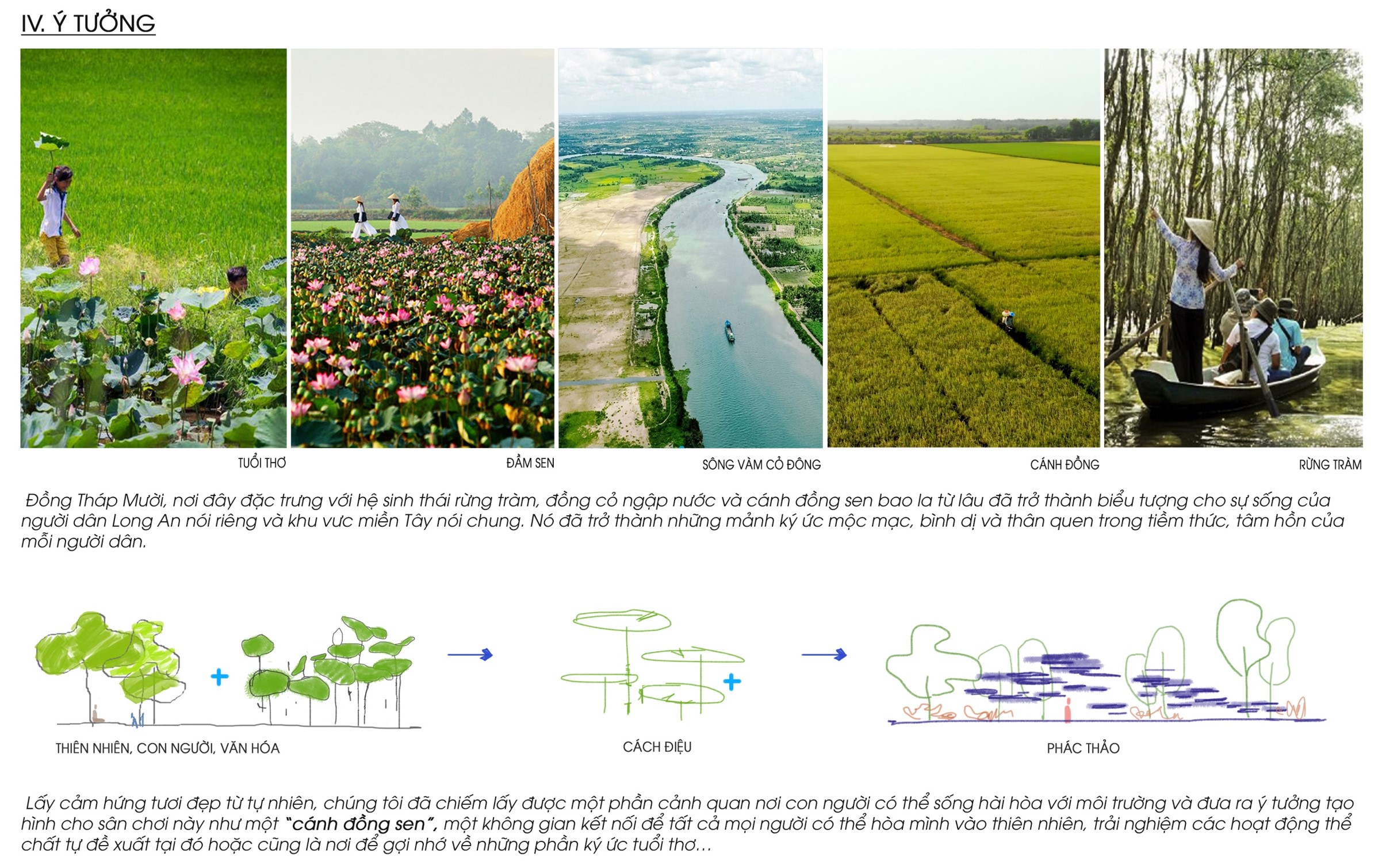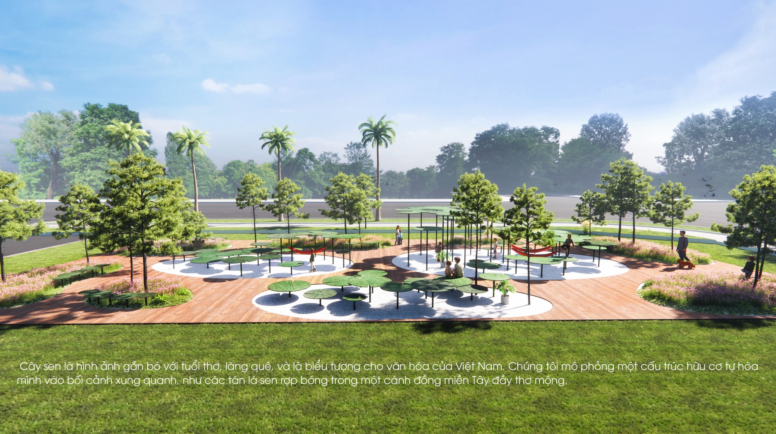 Lấy cảm hứng tươi đẹp từ tự nhiên, chúng tôi đã chiếm lấy được một phần cảnh quan nơi con người có thể sống hài hòa với môi trường và đưa ra ý tưởng tạo hình cho sân chơi này như một “cánh đồng sen”, một không gian kết nối để tất cả mọi người có thể hòa mình vào thiên nhiên, trải nghiệm các hoạt động thể chất tự đề xuất tại đó hoặc cũng là nơi để gợi nhớ về những phần ký ức tuổi thơ…