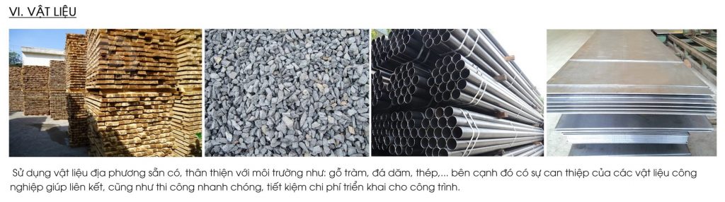 Sử dụng vật liệu địa phương sẵn có, thân thiện với môi trường như: gỗ tràm, đá dăm, thép,… bên cạnh đó có sự can thiệp của các vật liệu công nghiệp giúp liên kết, cũng như thi công nhanh chóng, tiết kiệm chi phí triển khai cho công trình.